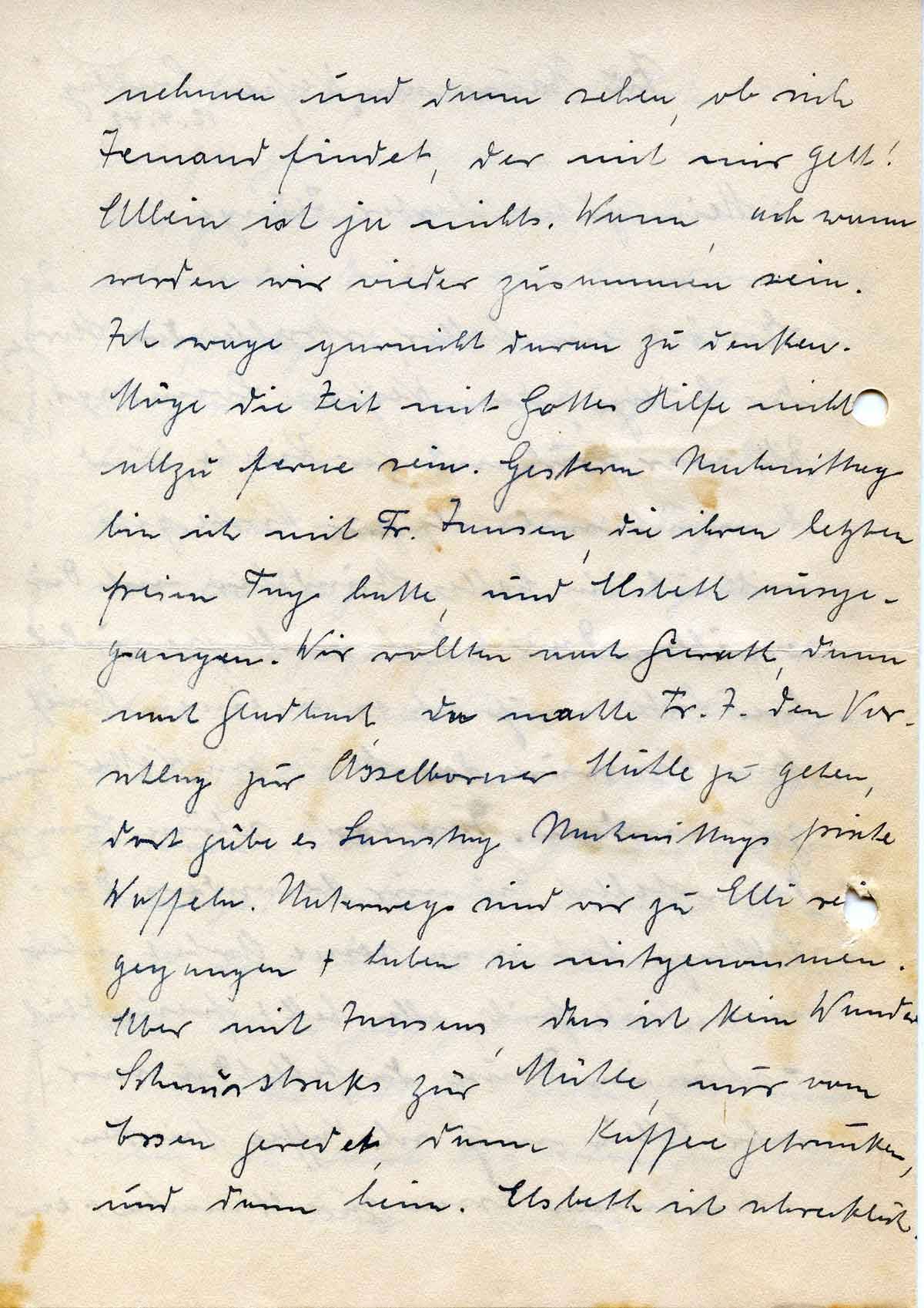 nehmen und dann sehen, ob sich Jemand findet, der mit mir geht! Allein ist ja nichts. Wann, ach wann werden wir wieder zusammen sein. Ich wage garnicht daran zu denken. Möge die Zeit mit Gottes Hilfe nicht allzu ferne sein. Gestern Nachmittag bin ich mit Fr. Jansen, die ihren letzten freien Tag hatte, und Elsbeth ausgegangen. Wir wollten nach Gierath, dann nach Gladbach, da machte Fr. J. den Vorschlag zur Asselborner Mühle zu gehen, dort gäbe es Samstag Nachmittags frische Waffeln. Unterwegs sind wir zu Elli reingegangen + haben sie mitgenommen. Aber mit Jansens, das ist kein Wunder. Schnurstracks zur Mühle, nur vom Essen geredet, dann Kaffee getrunken, und dann heim. Elsbeth ist schrecklich.