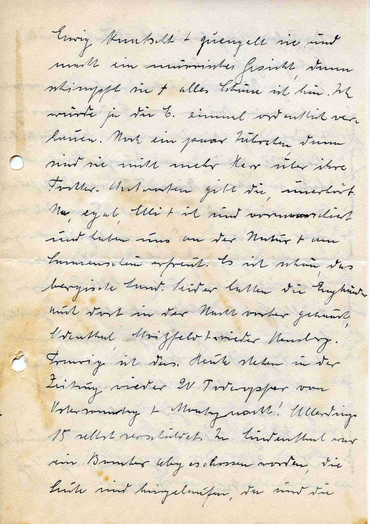 Ewig knatscht + zuengelt sie und macht ein mürrisches Gesicht, dann schimpft sie + alles Schöne ist hin. Ich würde ja die E. einmal ordentlich verhauen. Noch ein paar Jährchen, dann sind sie nicht mehr Herr über ihre Tochter. Antworten gibt die, unerhört. Na, egal, Elli + ich sind vormarschiert und haben uns an der Natur + am Sonnenschein erfreut. Es ist schön, das bergische Land. Leider hatten die Engländer auch dort in der Nacht vorher gehaust, Odenthal, Moitzfeld + wieder Bensberg. Traurig ist das. Heute stehen in der Zeitung wieder 20 Todesopfer von Ostersonntag + Montagnacht! Allerdings 15 selbst verschuldet. In Lindenthal war ein Bomber abgeschossen worden, die Leute sind hingelaufen, da sind die