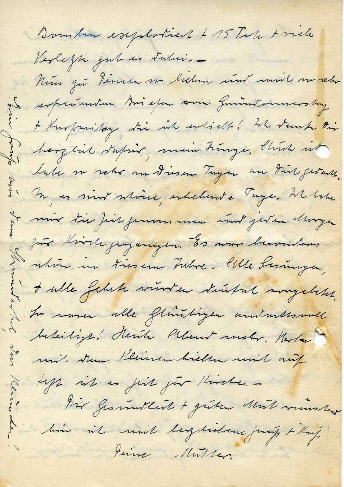 Nun zu Deinen so lieben und mich so sehr erfreuenden Briefen vom Gründonnerstag + Karfreitag, die ich erhielt! Ich danke Dir herzlich dafür, mein Junge. Auch ich habe so sehr an diesen Tagen an Dich gedacht. Ja, es sind schöne, erhebende Tage. Ich habe mir die Zeit genommen und jeden Morgen zur Kirche gegangen. Es war besonders schön in diesem Jahre. Alle Lesungen, + alle Gebete wurden deutsch vorgebetet. So waren alle Gläubigen andachtsvoll beteiligt! Heute Abend mehr. Berta mit dem Kleinen hielten mich auf. Jetzt ist es Zeit zur Kirche. –