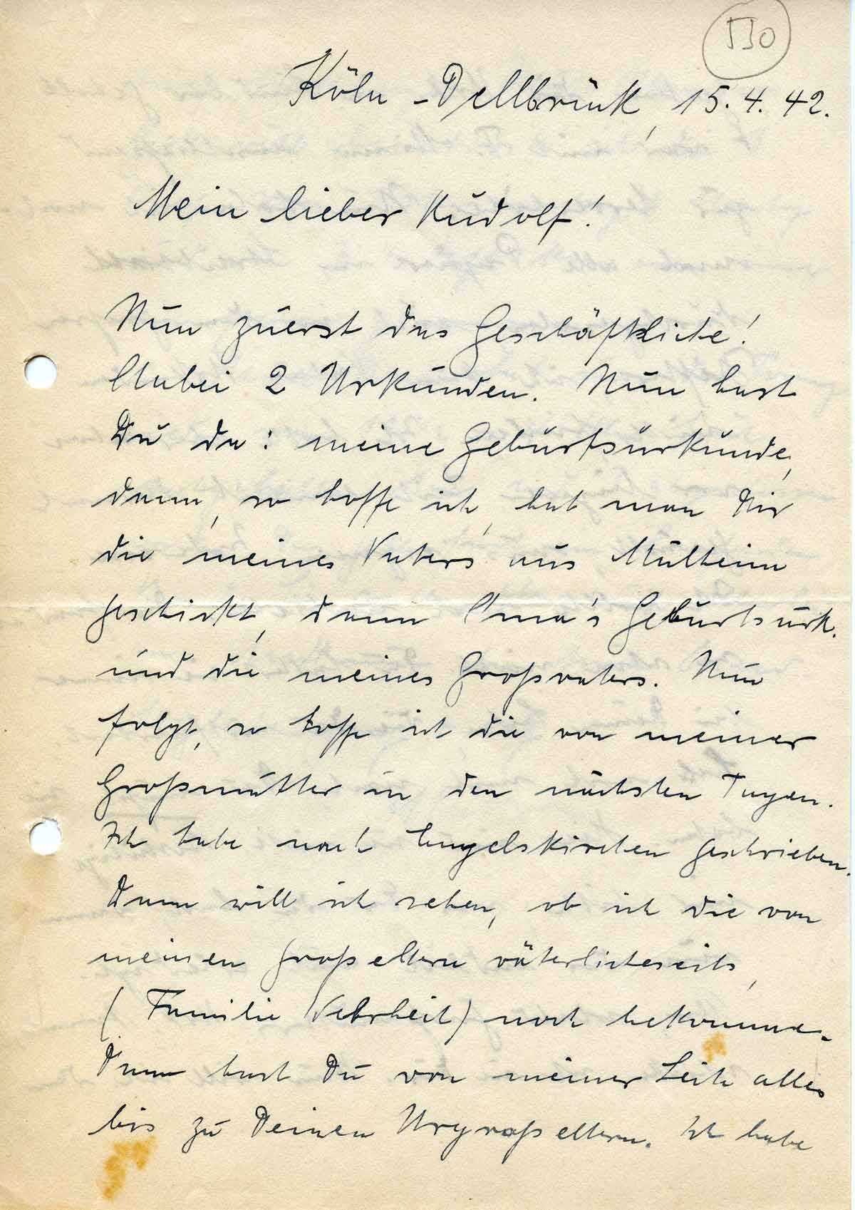 Nun zuerst das Geschäftliche! Anbei 2 Urkunden. Nun hast Du da: meine Geburtsurkunde, dann, so hoffe ich, hat man Dir die meines Vaters aus Mülheim geschickt, dann Oma’s Geburtsurk. und die meines Großvaters. Nun folgt, so hoffe ich die von meiner Großmutter in den nächsten Tagen. Ich habe nach Engelskirchen geschrieben. Dann will ich sehen, ob ich die von meinen Großeltern väterlicherseits, (Familie Wehrheit) noch bekomme. Dann hast Du von meiner Seite alles bis zu Deinen Urgroßeltern. Ich habe