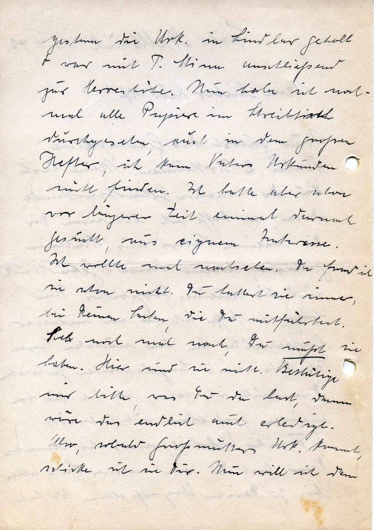 gestern die Urk. in Lindlar geholt + war mit T. Stina anschließend zur Herrenhöhe. Nun habe ich nochmal alle Papiere im Schreibtisch durchgesehen, auch in dem großen Hefter, ich kann Vaters Urkunden nicht finden. Ich hatte aber schon vor längerer Zeit einmal darnach gesucht, aus eignem Interesse. Ich wollte mal nachsehen. Da fand ich sie schon nicht. Du hattest sie immer bei Deinen Sachen, die Du mitführtest. Sieh noch mal nach, Du mußt sie haben. Hier sind sie nicht. Bestätige mir bitte, was Du da hast, dann wäre das endlich auch erledigt. Also, sobald Großmutters Urk. kommt, schicke ich sie Dir. Nun will ich den