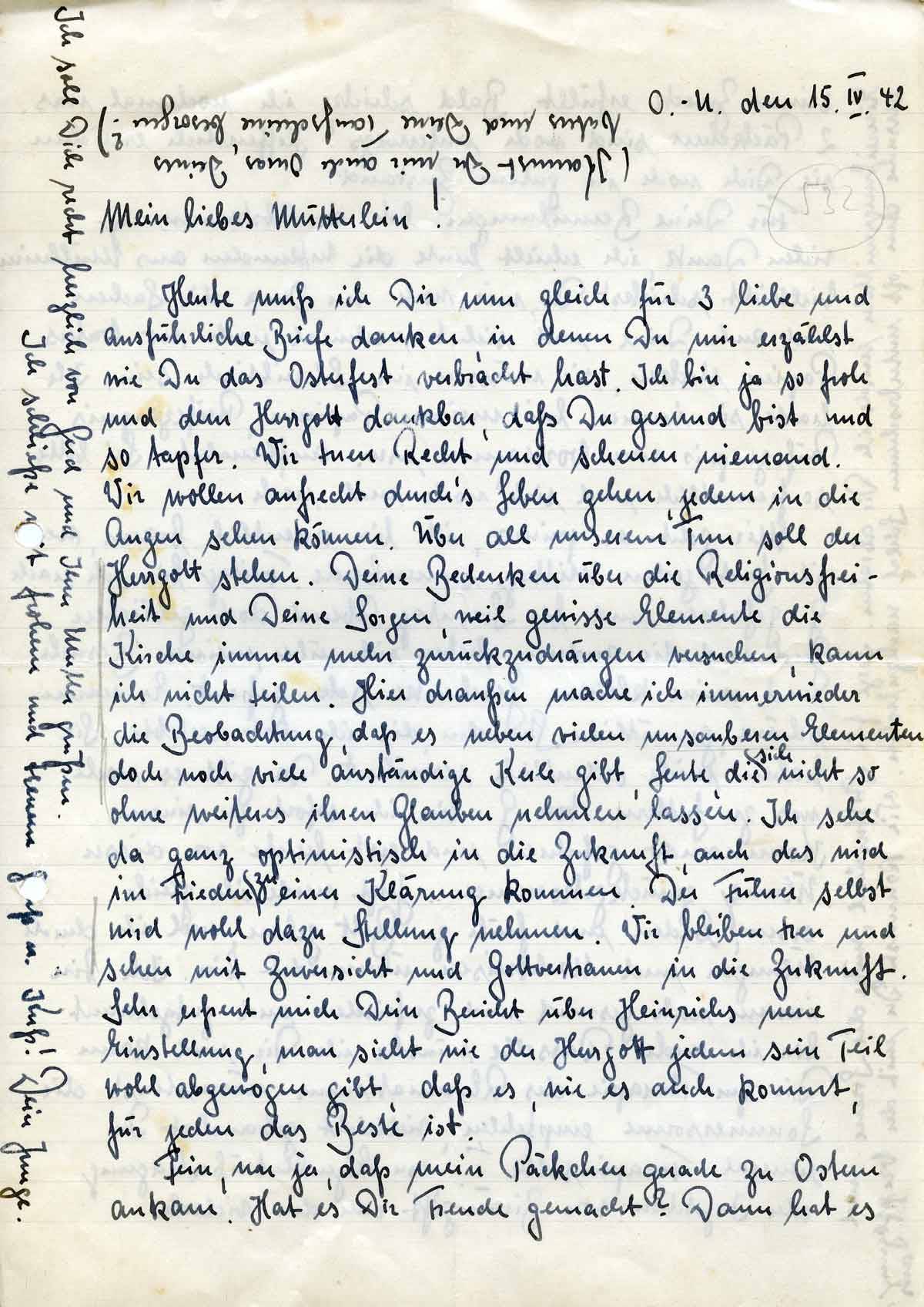 Heute muß ich Dir nun gleich für 3 liebe und ausführliche Briefe danken, in denen Du mir erzählst wie Du das Osterfest verbracht hast. Ich bin ja so froh und dem Herrgott dankbar, daß Du gesund bist und so tapfer. Wir tuen Recht und scheuen niemand. Wir wollen aufrecht durch’s Leben gehen, jedem in die Augen sehen können. Über all unserem Tun soll der Herrgott stehen. Deine Bedenken über die Religionsfreiheit und Deine Sorgen, weil gewisse Elemente die Kirche immer mehr zurückzudrängen versuchen, kann ich nicht teilen. Hier draußen mache ich immerwieder die Beobachtung, daß es neben vielen unsauberen Elementen doch noch viele anständige Kerle gibt, Leute, die sich nicht so ohne weiteres ihren Glauben nehmen lassen. Ich sehe da ganz optimistisch in die Zukunft, auch das wird im Frieden zu einer Klärung kommen. Der Führer selbst wird wohl dazu Stellung nehmen. Wir bleiben treu und sehen mit Zuversicht und Gottvertrauen in die Zukunft. Sehr erfreut mich Dein Bericht über Heinrichs neue Einstellung, man sieht wie der Herrgott jedem sein Teil wohl abgewogen gibt, daß es, wie es auch kommt, für jeden das Beste ist.