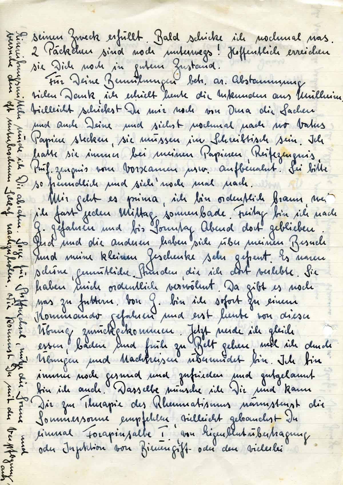 Mir geht es prima, ich bin ordentlich braun, weil ich fast jeden Mittag sonnenbade. Freitag bin ich nach G. gefahren und bis Sonntag Abend dort geblieben. Gerd und die anderen haben sich über meinen Besuch und meine kleinen Geschenke sehr gefreut. Es waren schöne, gemütliche Stunden, die ich dort verlebte. Sie haben mich ordentlich verwöhnt. Da gibt es noch was zu futtern. Von G. bin ich sofort zu einem Kommando gefahren und erst heute von dieser Übung zurückgekommen. Jetzt werde ich gleich essen, baden und früh zu Bett gehen, weil ich durch Übungen und Nachtreisen übermüdet bin. Ich bin immer noch gesund und zufrieden und gutgelaunt bin ich auch. Dasselbe wünsche ich Dir und kann Dir zur Therapie des Rheumatismus wärmstenst die Sommersonne empfehlen, vielleicht gebrauchst Du einmal Forapinsalbe I., von Eigenblutübertragung oder Injektion von Bienengift oder den vielerlei