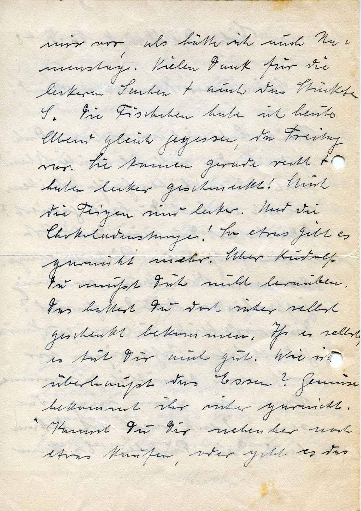 Heute habe ich so viel an Dich gedacht. Da will ich heute Abend noch einen lieben Gruß schicken. Wie ist es, hast Du heute gefeiert? Oder hattest Du keine Zeit? Ist mein Gruß + die Päckchen angekommen. Man kann so wenig jetzt schicken. Bist Du gesund? Du wirst heute auch an zu Hause gedacht haben. Jetzt säßen wir wohl noch gemütlich zusammen. Wann, ja wann mag das sein? Denk mal, ich bekam heute Dein Päckchen. Es kam
