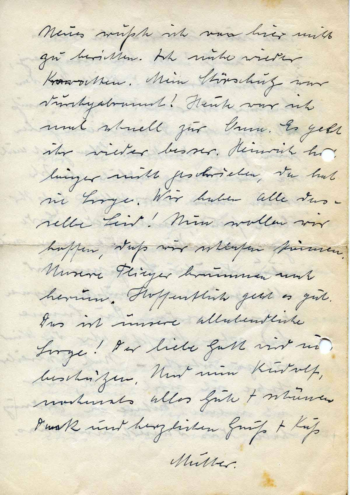 Neues wüßte ich von hier nichts zu berichten. Ich nähe wieder Krawatten. Mein Störschutz war durchgebrannt! Heute war ich mal schnell zur Oma. Es geht ihr wieder besser. Heinrich hat länger nicht geschrieben, da hat sie Sorge. Wir haben alle dasselbe Leid! nun wollen wir hoffen, daß wir schlafen können. Unsere Flieger brummen noch herum. Hoffentlich geht es gut. Das ist unsere allabendliche Sorge! Der liebe Gott wird uns beschützen. Und nun Rudolf, nochmals alles Gute + schönen Dank und herzlichen Gruß + Kuß