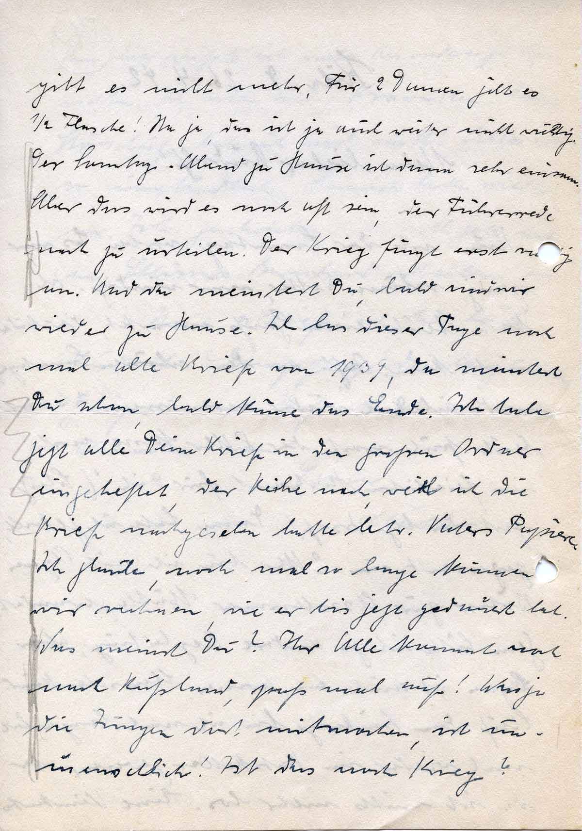 gibt es nicht mehr. Für 2 Damen gibt es ½ Flasche! Na ja, das ist ja auch weiter nicht wichtig. Der Sonntag-Abend zu Hause ist dann sehr einsam. Aber das wird es noch oft sein, der Führerrede nach zu urteilen. Der Krieg fängt erst richtig an. Und da meintest Du, bald sind wir wieder zu Hause. Ich las dieser Tage noch mal alte Briefe von 1939, da meintest Du schon, bald käme das Ende. Ich habe jetzt alle Deine Briefe in den großen Ordner eingeheftet, der Reihe nach, weil ich die Briefe nachgesehen hatte betr. Vaters Papiere. Ich glaube, noch mal so lange können wir rechnen, wie er bis jetzt gedauert hat. Was meinst Du? Ihr Alle kommt noch nach Rußland, paß mal auf! Was ja die Jungen dort mitmachen, ist unmenschlich! Ist das noch Krieg?