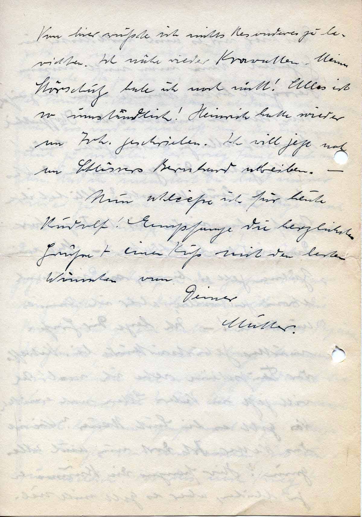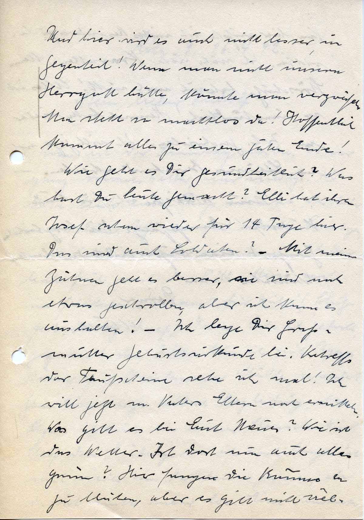 Von hier wüßte ich nichts Besonderes zu berichten. Ich nähe wieder Krawatten. Mein Störschutz habe ich noch nicht! Alles ist so umständlich! Heinrich hatte wieder an Joh. geschrieben. Ich will jetzt noch an Schlössers Bernhard schreiben. –