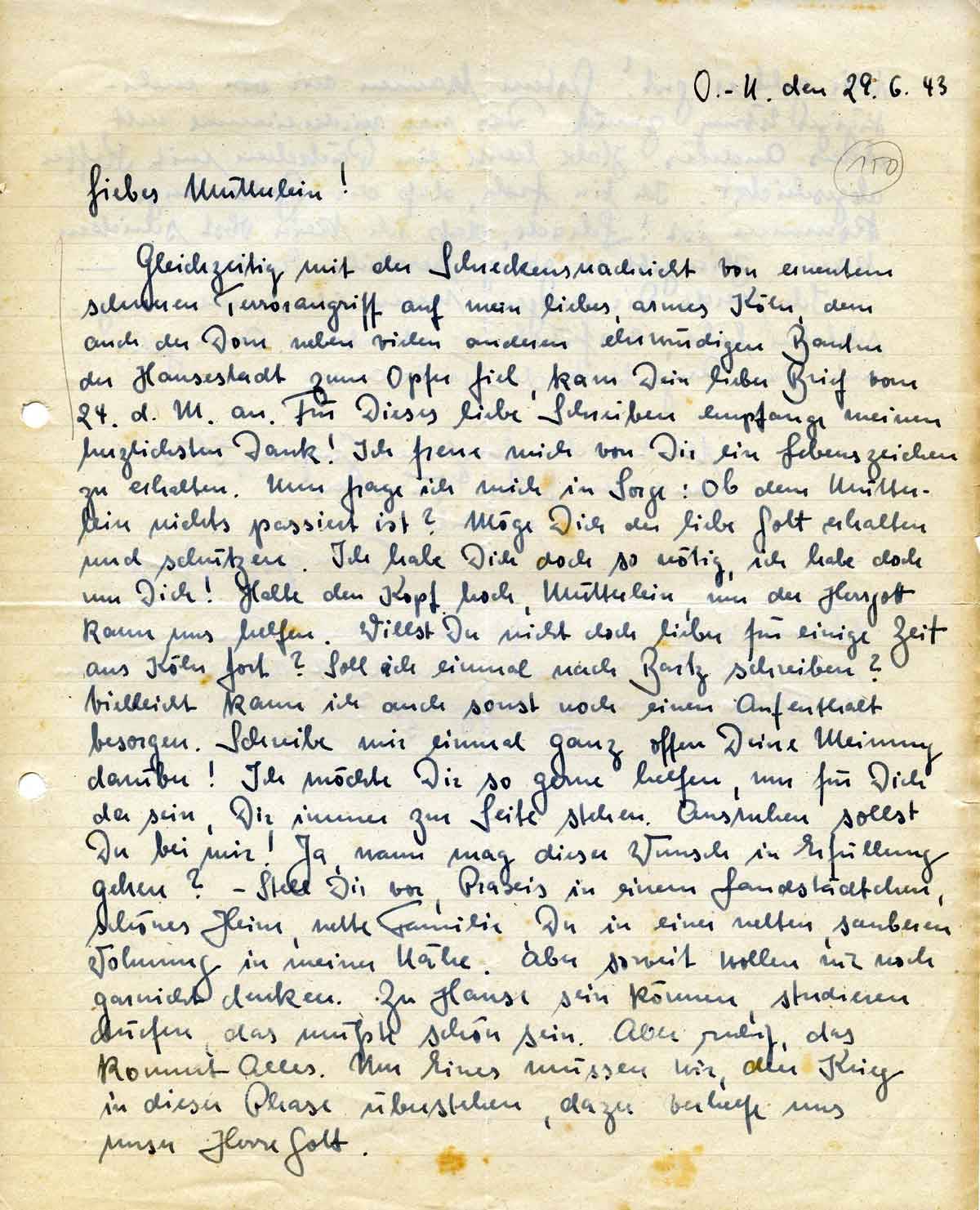 Gleichzeitig mit der Schreckensnachricht von erneutem schweren Terrorangriff auf mein liebes, armes Köln, dem auch der Dom neben vielen anderen ehrwürdigen Bauten der Hansestadt zum Opfer fiel, kam Dein lieber Brief vom 24. d. M. an. Für Dieses liebe Schreiben empfange meinen herzlichsten Dank! Ich freue mich von Dir ein Lebenszeichen zu erhalten. Nun frage ich mich in Sorge: ob dem Mütterlein nichts passiert ist? Möge Dich der liebe Gott erhalten und schützen. Ich habe Dich doch so nötig, ich habe doch nur Dich! Halte den Kopf hoch, Mütterlein, nur der Herrgott kann uns helfen. Willst Du nicht doch lieber für einige Zeit aus Köln fort? Soll ich einmal nach Bartz schreiben? Vielleicht kann ich auch sonst noch einen Aufenthalt besorgen. Schreibe mir einmal ganz offen Deine Meinung darüber! Ich möchte Dir so gerne helfen, nur für Dich da sein, Dir immer zur Seite stehen. Ausruhen sollst Du bei mir! Ja, wann mag dieser Wunsch in Erfüllung gehen? – Stell Dir vor, Praxis in einem Landstädtchen, schönes Heim, nette Familie, Du in einer netten, sauberen Wohnung in meiner Nähe. Aber soweit wollen wir noch garnicht denken. Zu Hause sein können, studieren dürfen, das müßte schön sein. Aber ruhig, das kommt Alles. Nur Eines müssen wir, den Krieg in dieser Phase überstehen, dazu verhelfe uns unser Herre Gott.