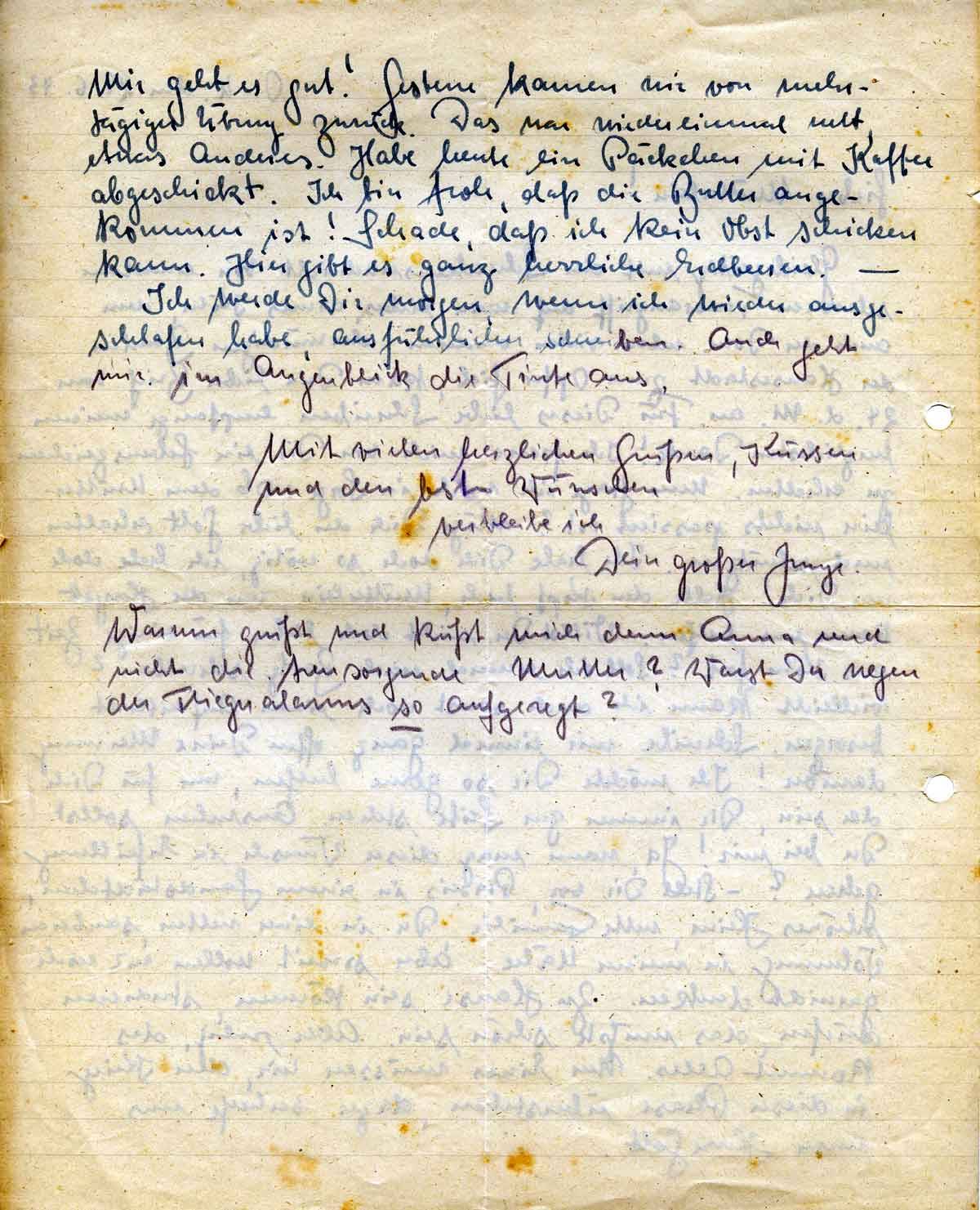 Mir geht es gut! Gestern kamen wir von mehrtägiger Übung zurück. Das war wiedereinmal nett, etwas Anderes. Habe heute ein Päckchen mit Kaffee abgeschickt. Ich bin froh, daß die Butter angekommen ist! Schade, daß ich kein Obst schicken kann. Hier gibt es ganz herrliche Erdbeeren. –