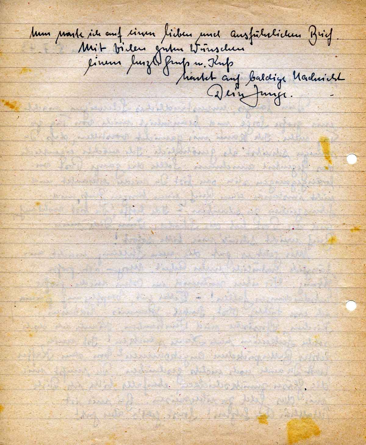 Dein langes, unverständliches Schweigen macht mir große Sorge und beunruhigt mich von Tag zu Tag mehr. Ich kann mir garnicht vorstellen, daß Du weniger schreibst als gewöhnlich. Ich möchte eigentlich das Gegenteil annehmen. Sollte die ganze Post verlorengegangen sein oder bist Du wieder erkrankt und nicht imstande einen Brief, einen kurzen Gruß, und Lebenszeichen zu schreiben? Ich hoffe, Du bist wohlauf, und die Post hat die Schuld. Wenn Dich mein Brief erreicht schreib‘ mir bitte sofort!