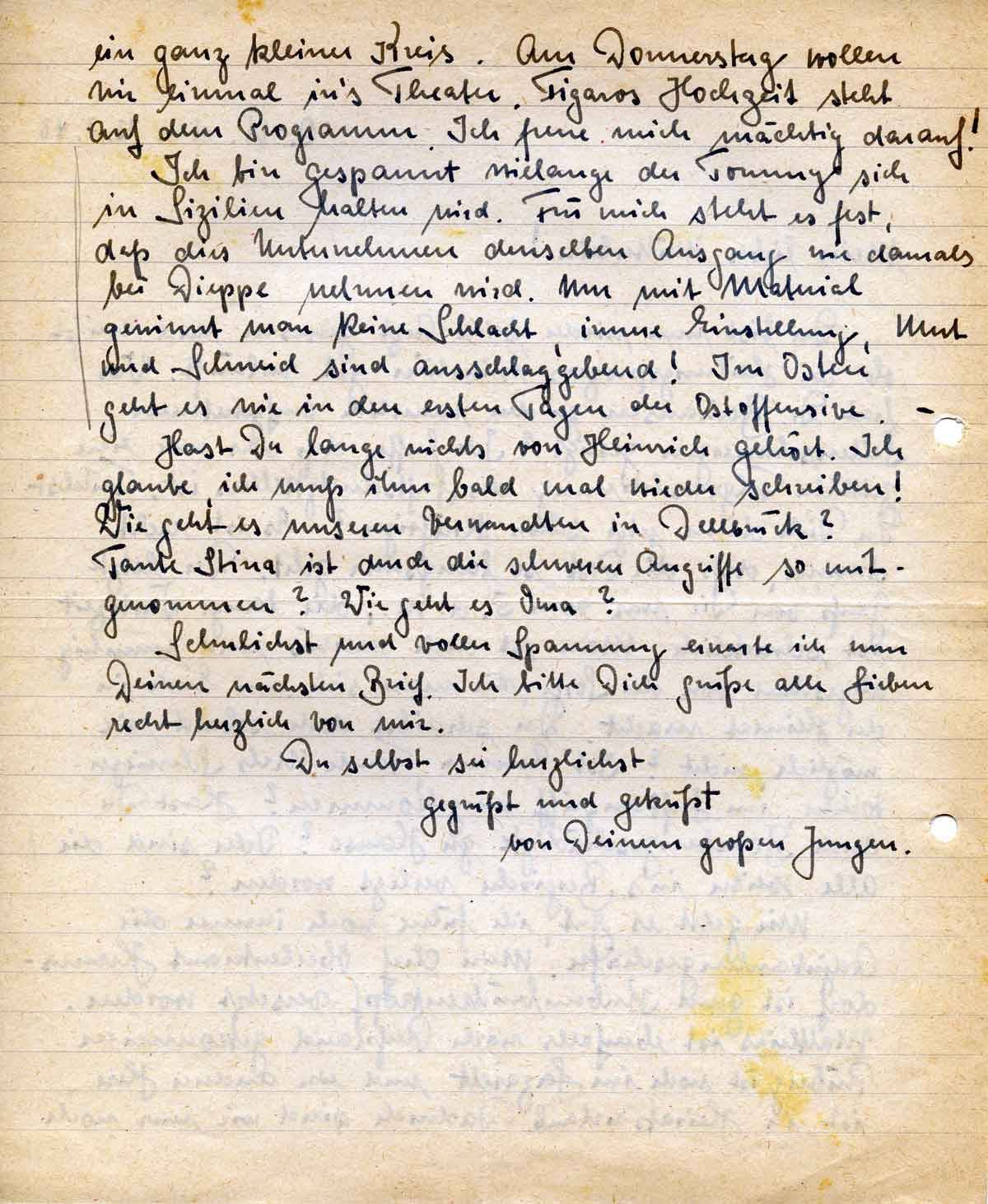 Hast Du lange nichts von Heinrich gehört. Ich glaube, ich muß ihm bald mal wieder schreiben! Wie geht es unseren Verwandten in Dellbrück? Tante Stina ist durch die schweren Angriffe so mitgenommen? Wie geht es Oma?