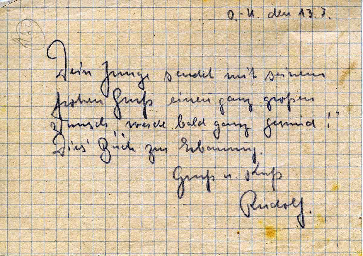 Rudolf Schmitz an Mutter Anna, 13. Juli 1943 O.-U. den 13.7. Dein Junge sendet mit seinem frohen Gruß einen ganz großen Wunsch, „werde bald ganz gesund!“ Dies‘ Buch zur Erbauung. Gruß u. Kuß Rudolf.
