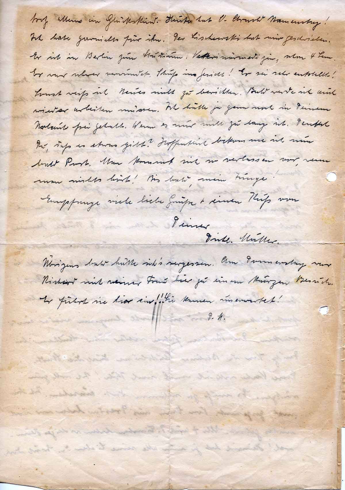 trotz allem ein Glückskind. Heute hat O. Arnold Namenstag! Ich habe garnichts für ihn. Der Lischewski hat mir geschrieben. Er ist in Berlin zum Studium. Veterinärmedizin, schon 4 Sem. Er war schwer verwundet. Schuß ins Gesicht! Er sei sehr entstellt!