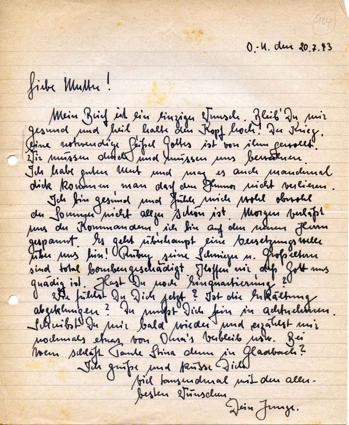 Ich bin gesund und fühle mich wohl obwohl der Sommer nicht allzu schön ist. Morgen verläßt uns der Kommandeur, ich bin auf den neuen Herrn gespannt. Es geht überhaupt eine Versetzungswelle über uns hin! Rüberg, seine Schwieger u. Großeltern sind total bombengeschädigt. Hoffen wir, daß Gott uns gnädig ist. Hast Du noch Einquartierung?