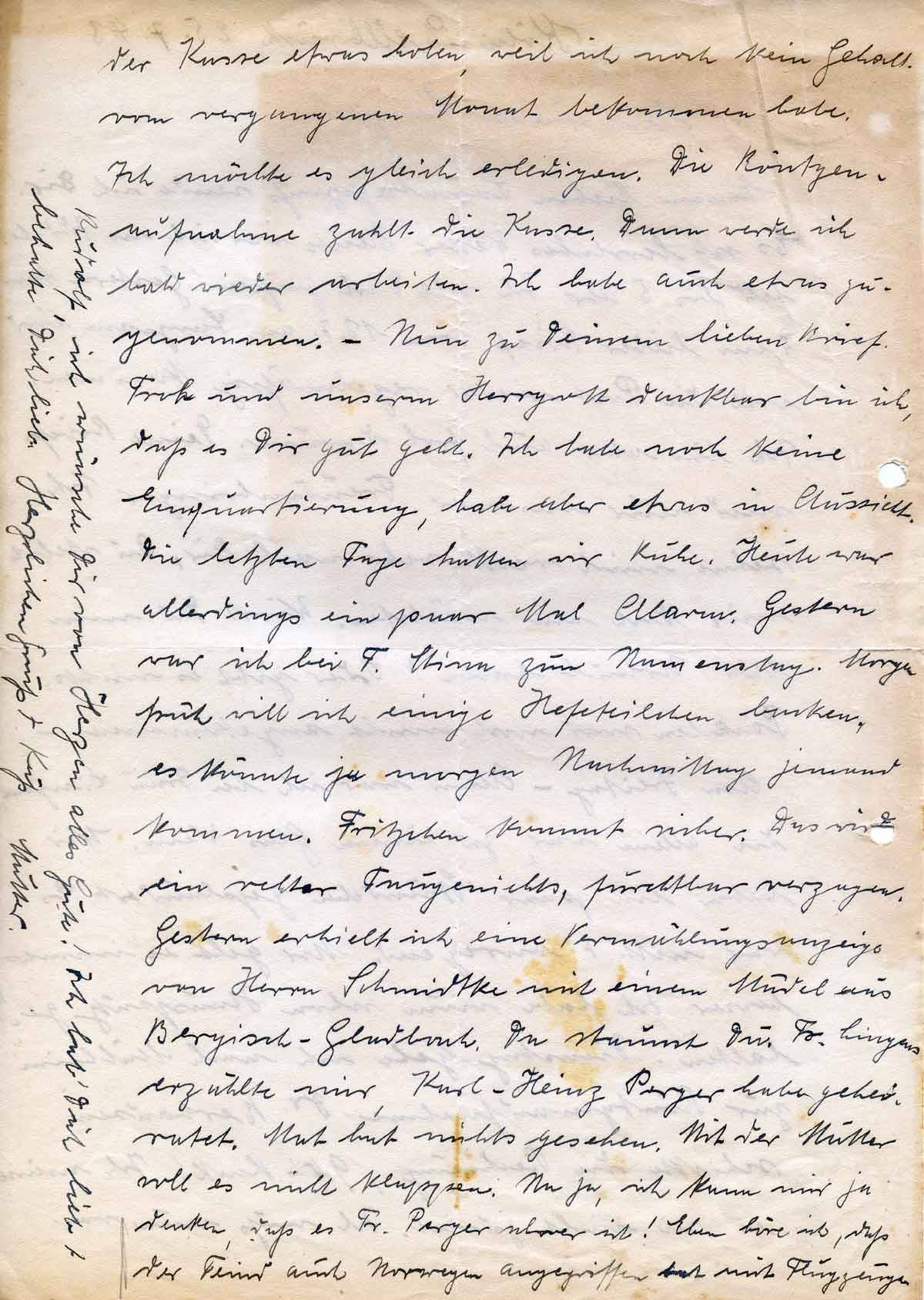 der Kasse etwas holen, weil ich noch kein Gehalt vom vergangenen Monat bekommen habe. Ich möchte es gleich erledigen. Die Röntgenaufnahme zahlt die Kasse. Dann werde ich bald wieder arbeiten. Ich habe auch etwas zugenommen. – Nun zu Deinem lieben Brief. Froh und unserm Herrgott dankbar bin ich, daß es Dir gut geht. Ich habe noch keine Einquartierung, habe aber etwas in Aussicht. Die letzten Tage hatten wir Ruhe. Heute war allerdings ein paar Mal Alarm. Gestern war ich bei T. Stina zum Namenstag. Morgen früh will ich einige Hefeteilchen backen, es könnte ja morgen Nachmittag jemand kommen. Fritzchen kommt sicher. Das wird ein rechter Taugenichts, furchtbar verzogen. Gestern erhielt ich eine Vermählungsanzeige von Herrn Schmidtke mit einem Mädel aus Bergisch-Gladbach. Da staunst Du. Fr. Lingens erzählte mir, Karl-Heinz Perger habe geheiratet. Mat[?] hat nichts gesehen. Mit der Mutter soll es nicht klappen. Na ja, ich kann mir ja denken, daß es Fr. Perger schwer ist! Eben höre ich, daß der Feind auch Norwegen angegriffen hat mit Flugzeugen.