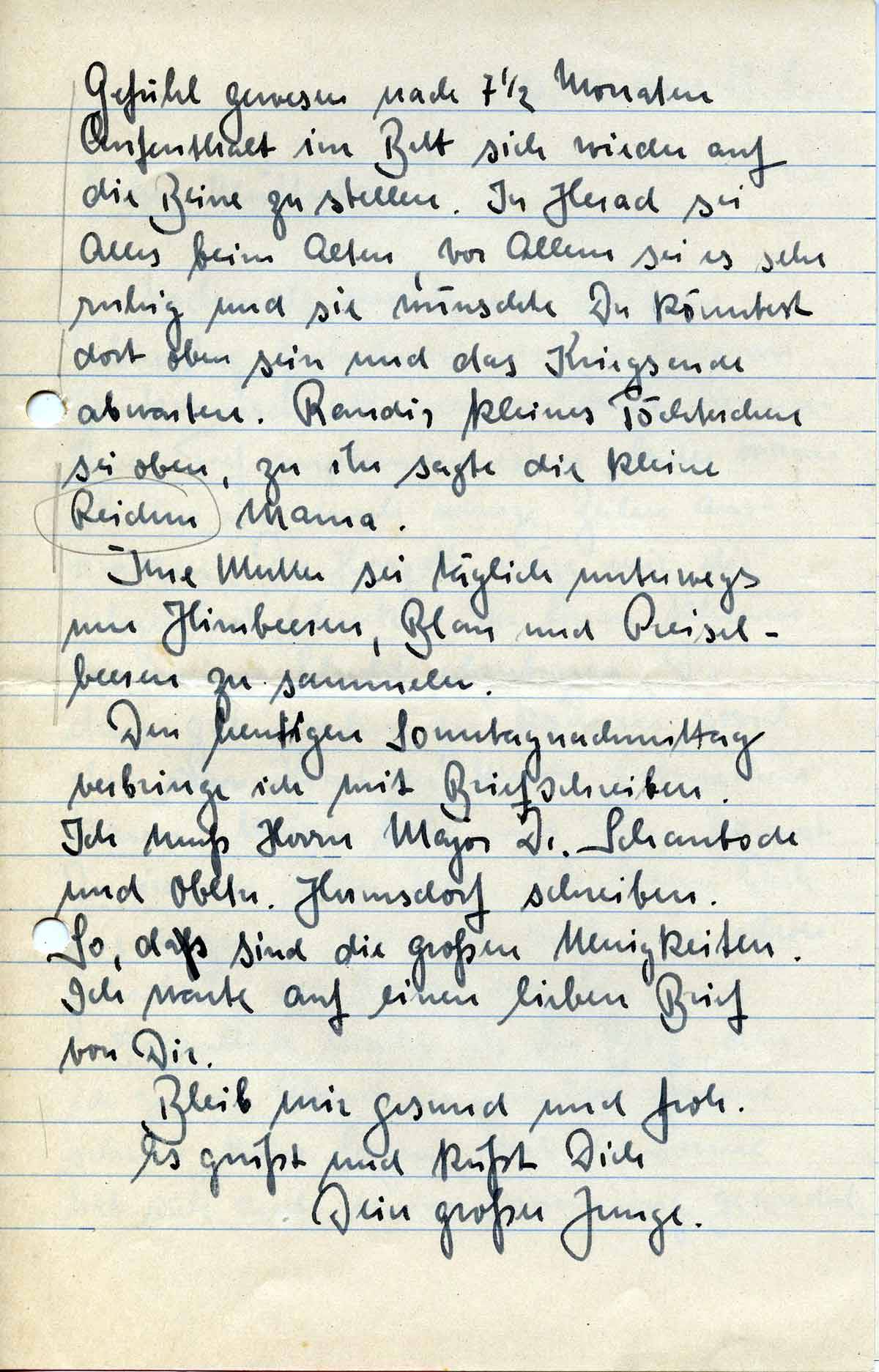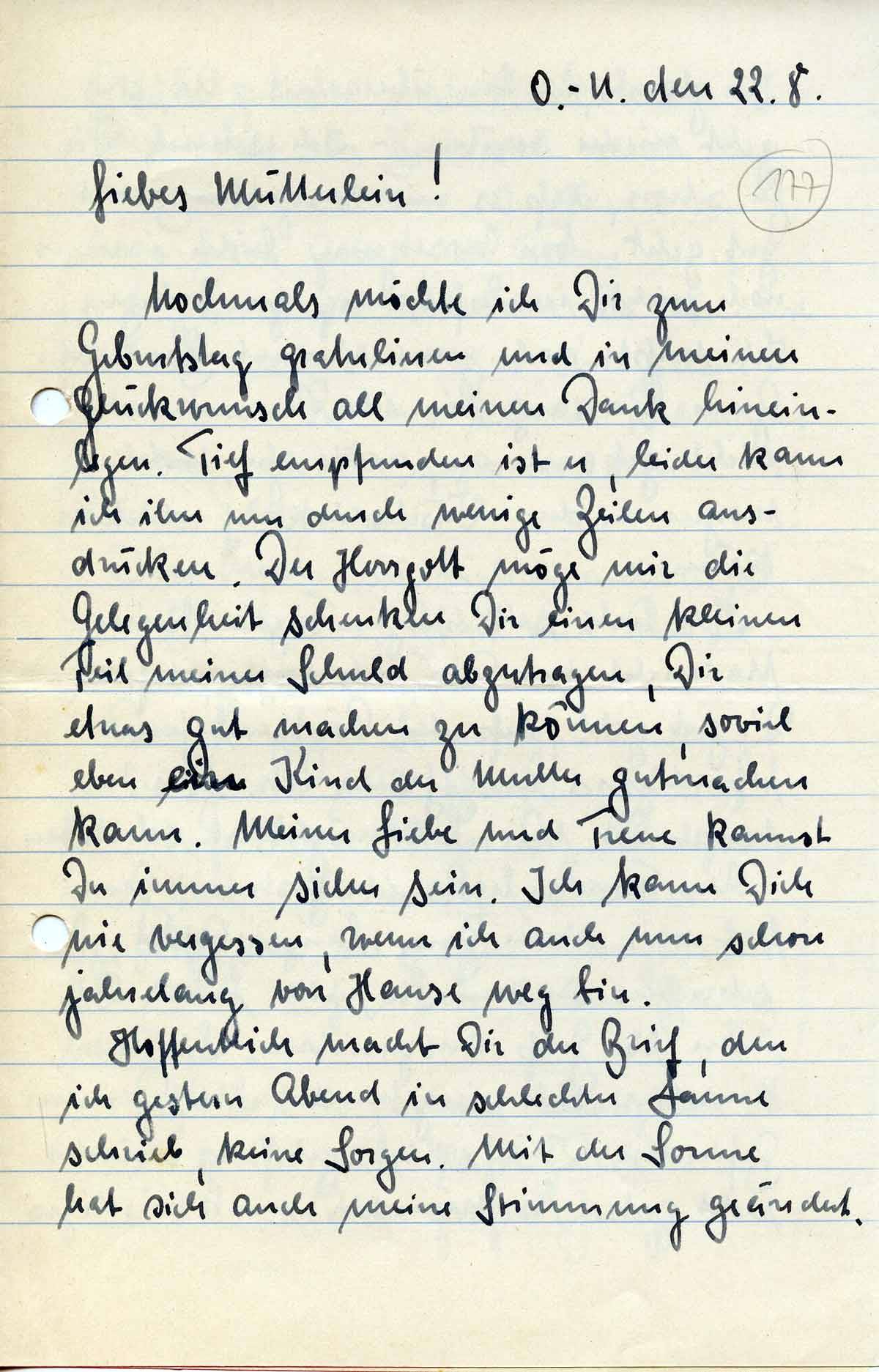 Nochmals möchte ich Dir zum Geburtstag gratulieren und in meinen Glückwunsch all meinen Dank hineinlegen. Tief empfunden ist er, leider kann ich ihn nur durch wenige Zeilen ausdrücken. Der Herrgott möge mir die Gelegenheit schenken Dir einen kleinen Teil meiner Schuld abzutragen, Dir etwas gut machen zu können, soviel eben ein Kind der Mutter gutmachen kann. Meiner Liebe und Treue kannst Du immer sicher sein. Ich kann Dich nie vergessen, wenn ich auch nun schon jahrelang von Hause weg bin.