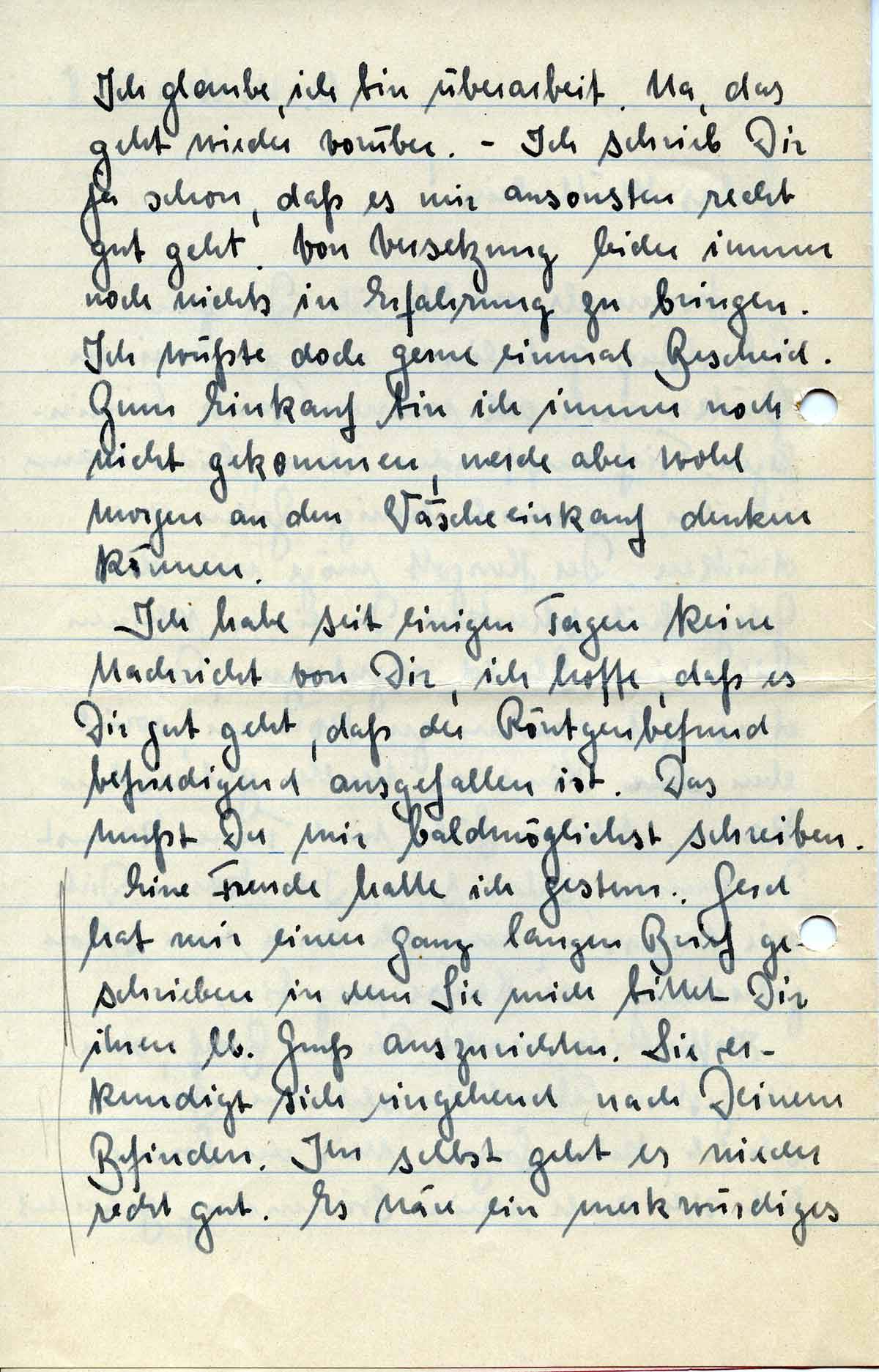 Ich habe seit einigen Tagen keine Nachricht von Dir, ich hoffe, daß es Dir gut geht, daß der Röntgenbefund befriedigend ausgefallen ist. Das mußt Du mir baldmöglichst schreiben.