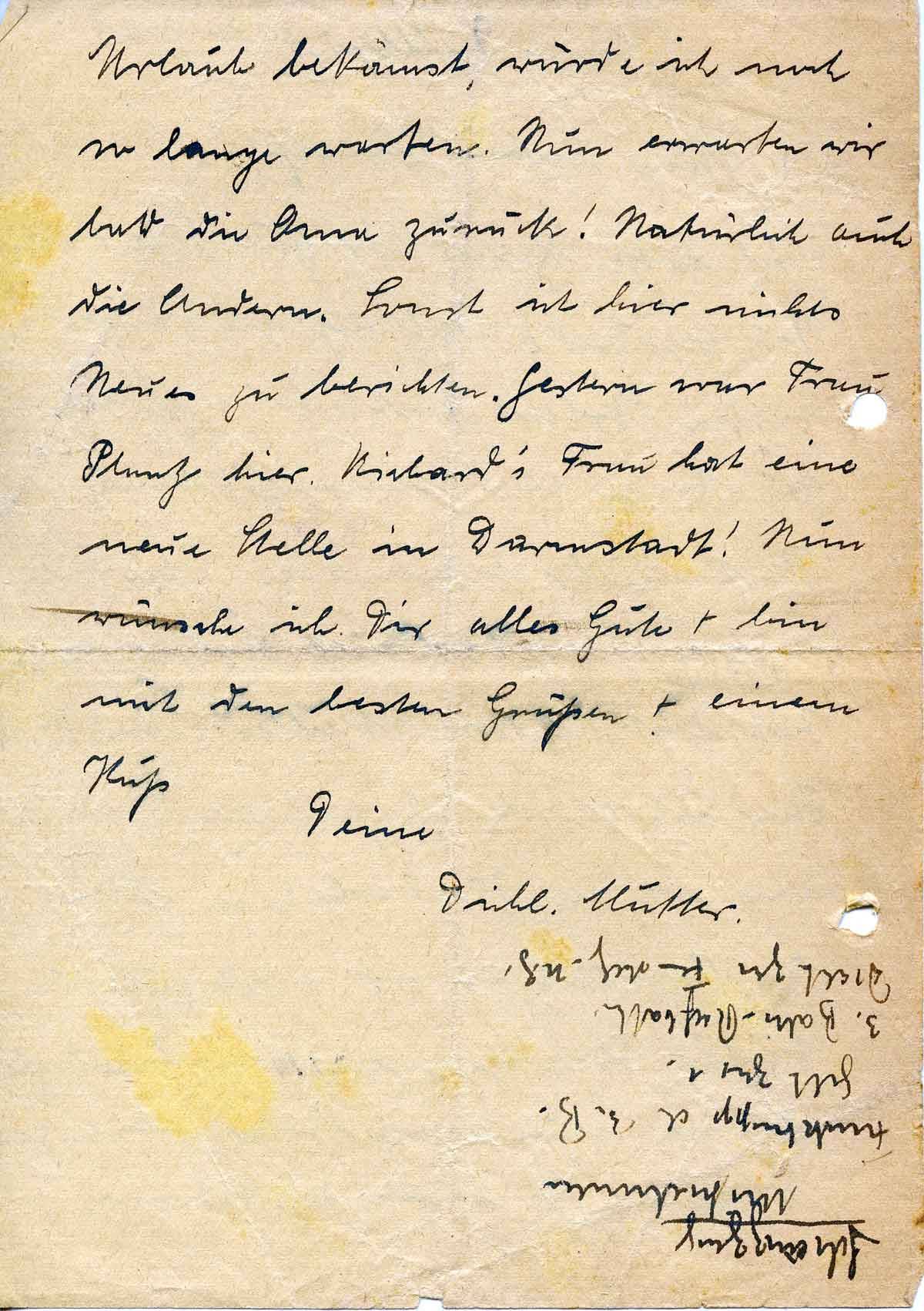 Urlaub bekämst, würde ich noch so lange warten. Nun erwarten wir bald die Oma zurück! Natürlich auch die Andern. Sonst ist hier nichts Neues zu berichten. Gestern war Frau Plantz hier. Richard’s Frau hat eine neue Stelle in Darmstadt! Nun wünsche ich Dir alles Gute + bin mit den besten Grüßen + einem Kuß