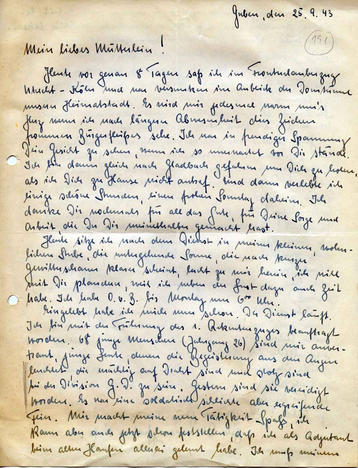 Heute vor genau 8 Tagen saß ich im Fronturlauberzug Utrecht – Köln und war versunken im Anblick der Domtürme unserer Heimatstadt. Es wird mir jedesmal warm um’s Herz wenn ich nach längerer Abwesenheit dies Zeichen frommen Bürgerfleißes sehe. Ich war in freudiger Spannung Dein Gesicht zu sehen, wenn ich so unerwartet vor Dir stände. Ich bin dann gleich nach Gladbach gefahren um Dich zu holen, als ich Dich zu Hause nicht antraf. Und dann verlebte ich einige schöne Stunden, einen frohen Sonntag daheim. Ich danke Dir nochmals für all das Gute, für Deine Sorge und Arbeit, die Du Dir meinethalber gemacht hast.