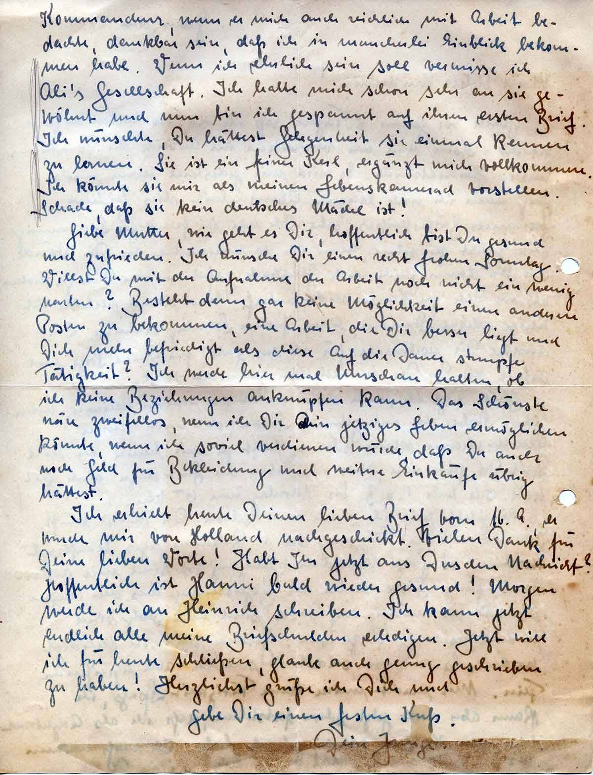 Liebe Mutter, wie geht es Dir, hoffentlich bist Du gesund und zufrieden. Ich wünsche Dir einen recht frohen Sonntag. Willst Du mit der Aufnahme der Arbeit noch nicht ein wenig warten? Besteht denn gar keine Möglichkeit einen anderen Posten zu bekommen, eine Arbeit, die Dir besser liegt und Dich mehr befriedigt als diese auf die Dauer stumpfe Tätigkeit? Ich werde hier mal Umschau halten, ob ich keine Beziehungen anknüpfen kann. Das Schönste wäre zweifellos, wenn ich Dir Dein jetziges Leben ermöglichen könnte, wenn ich soviel verdienen würde, daß Du auch noch Geld für Bekleidung und weitere Einkäufe übrig hättest.