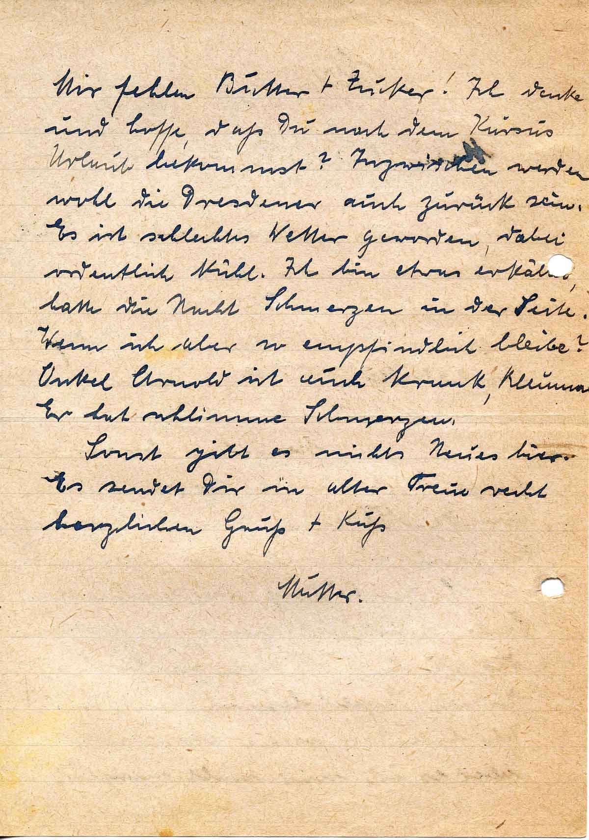 Mir fehlen Butter + Zucker! Ich denke und hoffe, daß Du nach dem Kursus Urlaub bekommst? Inzwischen werden wohl die Dresdener auch zurück sein. Es ist schlechtes Wetter geworden, dabei ordentlich kühl. Ich bin etwas erkältet, hatte die Nacht Schmerzen in der Seite. Wenn ich aber so empfindlich bleibe? Onkel Arnold ist auch krank, Rheuma. Er hat schlimme Schmerzen.