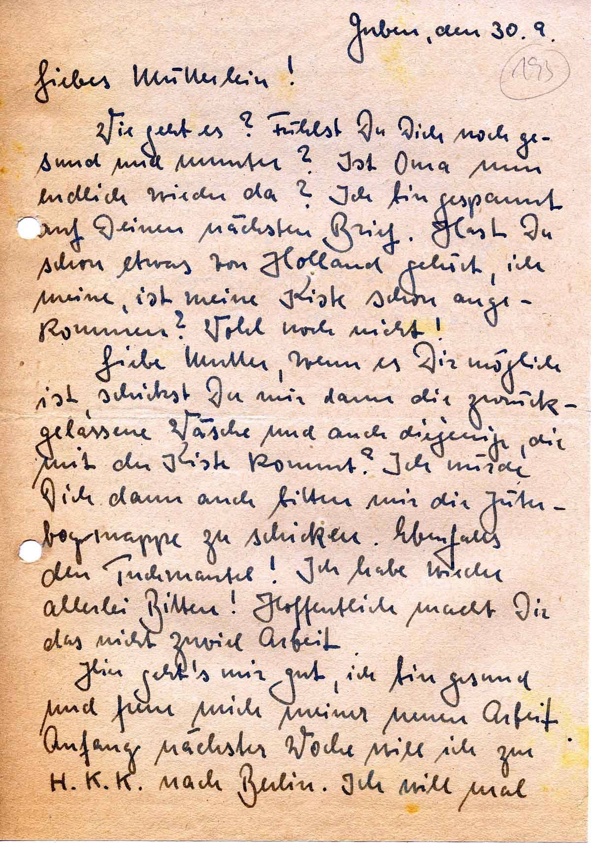 Liebe Mutter, wenn es Dir möglich ist, schickst Du mir dann die zurückgelassene Wäsche und auch diejenige, die mit der Kiste kommt? Ich würde Dich dann auch bitten mir die Jüterbogmappe zu schicken. Ebenfalls den Tuchmantel! Ich habe wieder allerlei Bitten! Hoffentlich macht Dir das nicht zuviel Arbeit.