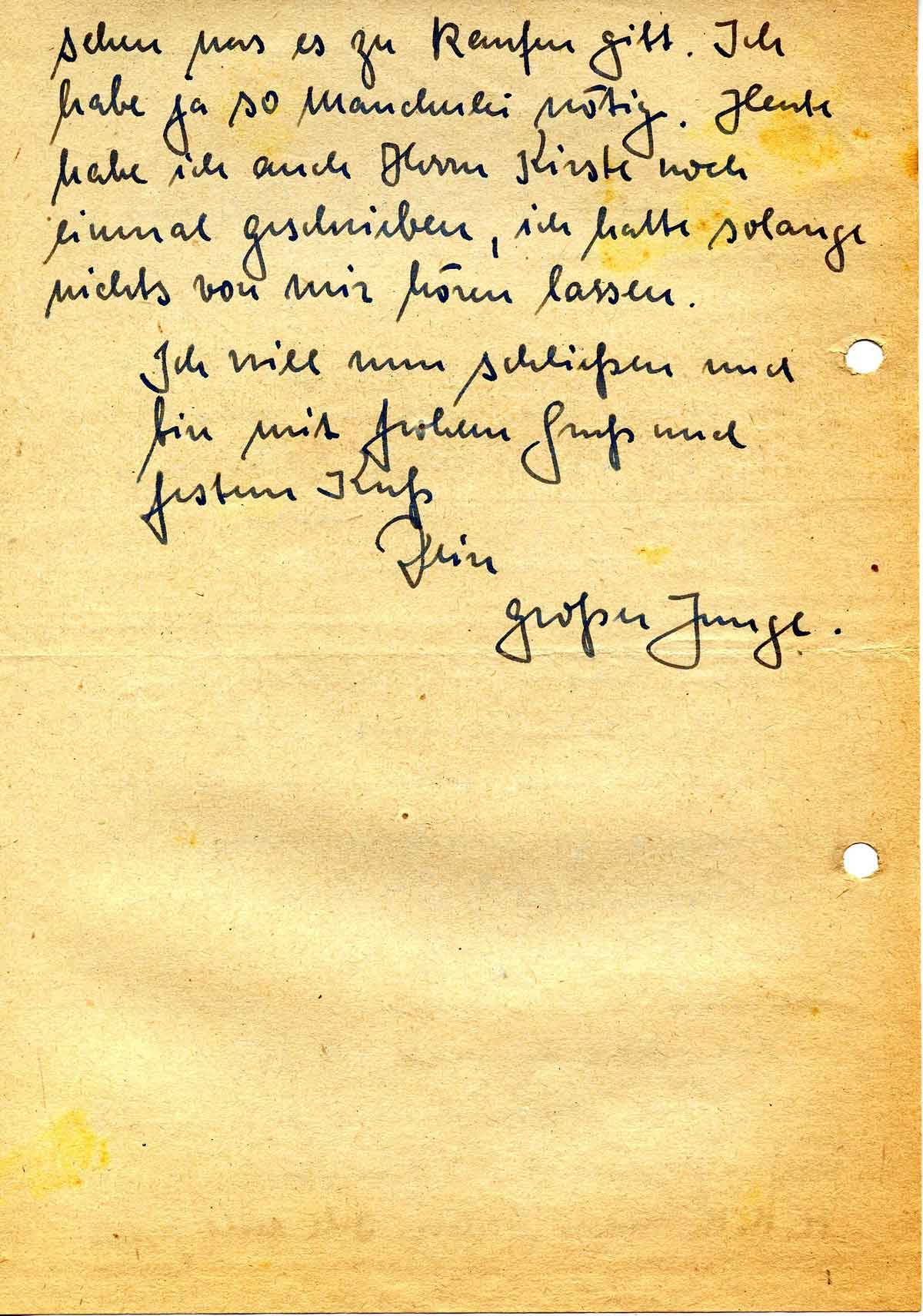 Wie geht es? Fühlst Du Dich noch gesund und munter? Ist Oma nun endlich wieder da? Ich bin gespannt auf Deinen nächsten Brief. Hast Du schon etwas von Holland gehört, ich meine, ist meine Kiste schon angekommen? Wohl noch nicht!