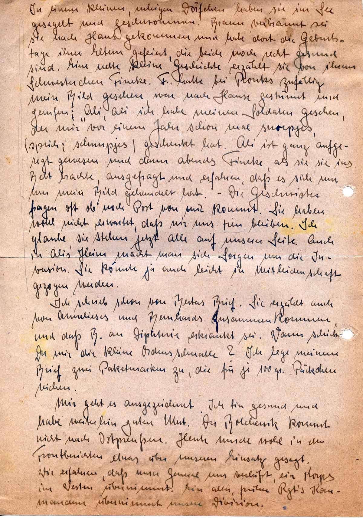 In einem kleinen, ruhigen Dörfchen haben sie im See gesegelt und geschwommen. Braun verbrannt sei sie nach Haus gekommen und habe dort die Geburtstage ihrer Eltern gefeiert, die beide noch recht gesund sind. Eine nette kleine Geschichte erzählt sie von ihrem Schwesterchen Fincke. F. hatte bei Pronks zufällig mein Bild gesehen, war nach Hause gestürmt und gerufen: „Ali, Ali ich habe meinen Soldaten gesehen, der mir vor einem Jahr schon mal snoepjes, (sprich: schnupjes) geschenkt hat. Ali ist ganz aufgeregt gewesen und dann abends Fincke, als sie sie ins Bett brachte, ausgefragt und erfahren, daß es sich nur um mein Bild gehandelt hat. – Die Geschwister fragen oft ob noch Post von mir kommt. Sie haben wohl nicht erwartet, daß wir uns treu bleiben. Ich glaube, sie stehen jetzt alle auf unserer Seite. Auch in Alis Heim macht man sich Sorgen um die Invasion. Sie könnte ja auch leicht in Mitleidenschaft gezogen werden.