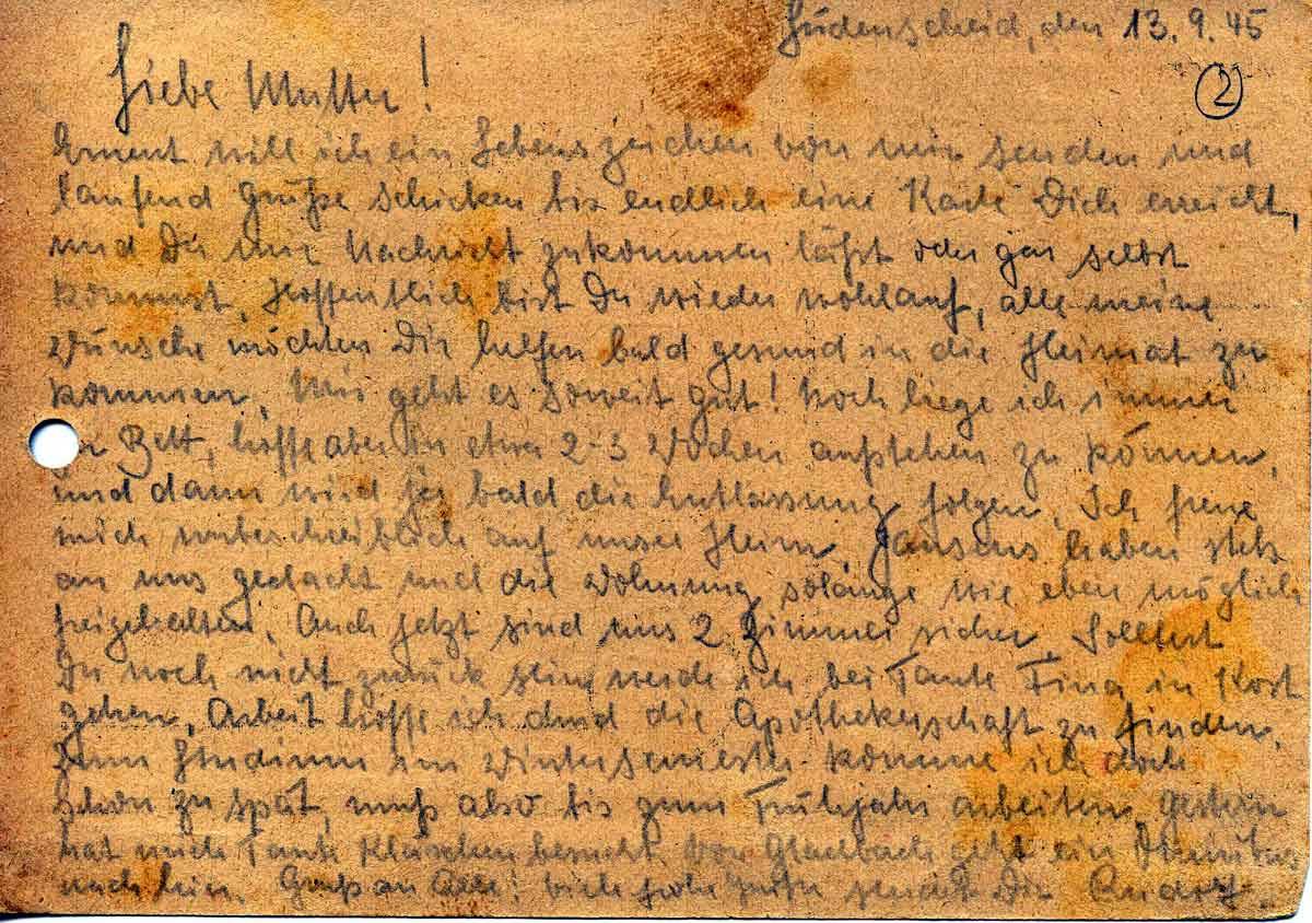 Erneut will ich ein Lebenszeichen von mir senden und laufend Grüße schicken bis endlich einen Karte Dich erreicht, und Du mir Nachricht zukommen läßt oder gar selbst kommst. Hoffentlich bist Du wieder wohlauf, alle meine Wünsche möchten Dir helfen bald gesund in die Heimat zu kommen. Mir geht es soweit gut! Noch liege ich immer im Bett, hoffe aber in etwa 2-3 Wochen aufstehen zu können, und dann wird ja bald die Entlassung folgen. Ich freue mich unbeschreiblich auf unser Heim. Jansens haben stets an uns gedacht und die Wohnung solange wie eben möglich freigehalten. Auch jetzt sind uns 2 Zimmer sicher. Solltest Du noch nicht zurück sein werde ich bei Tante Fina in Kost gehen. Arbeit hoffe ich durch die Apothekerschaft zu finden. Zum Studium im Wintersemester komme ich doch schon zu spät, muß also bis zum Frühjahr arbeiten. Gestern hat mich Tante Klärchen besucht. Von Gladbch geht ein Omnibus nach hier. Gruß an Alle! Viele frohe Grüße sendet Dir Rudolf.
