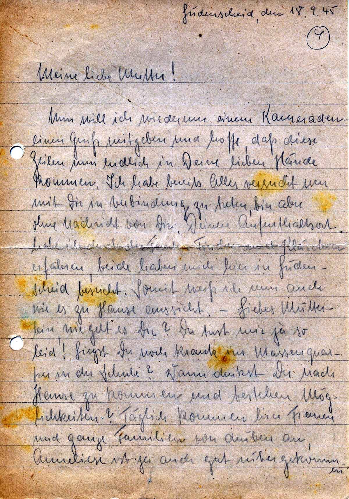 Nun will ich wiederum einem Kameraden einen Gruß mitgeben und hoffe, daß diese Zeilen nun endlich in Deine lieben Hände kommen. Ich habe bereits Alles versucht um mit Dir in Verbindung zu treten, bin aber ohne Nachricht von Dir. Deinen Aufenthaltsort habe ich durch die Tanten Finchen und Klärchen erfahren, beide haben mich hier in Lüdenscheid besucht. Somit weiß ich nun auch wie es zu Hause aussicht. – Liebes Mütterlein, wie geht es Dir? Du tust mir ja so leid! Liegst Du noch krank im Massenquartier in der Schule? Wann denkst Du nach Hause zu kommen und bestehen Möglichkeiten? Täglich kommen hier Frauen und ganze Familien von drüben an, Anneliese ist ja auch gut rübergekommen.