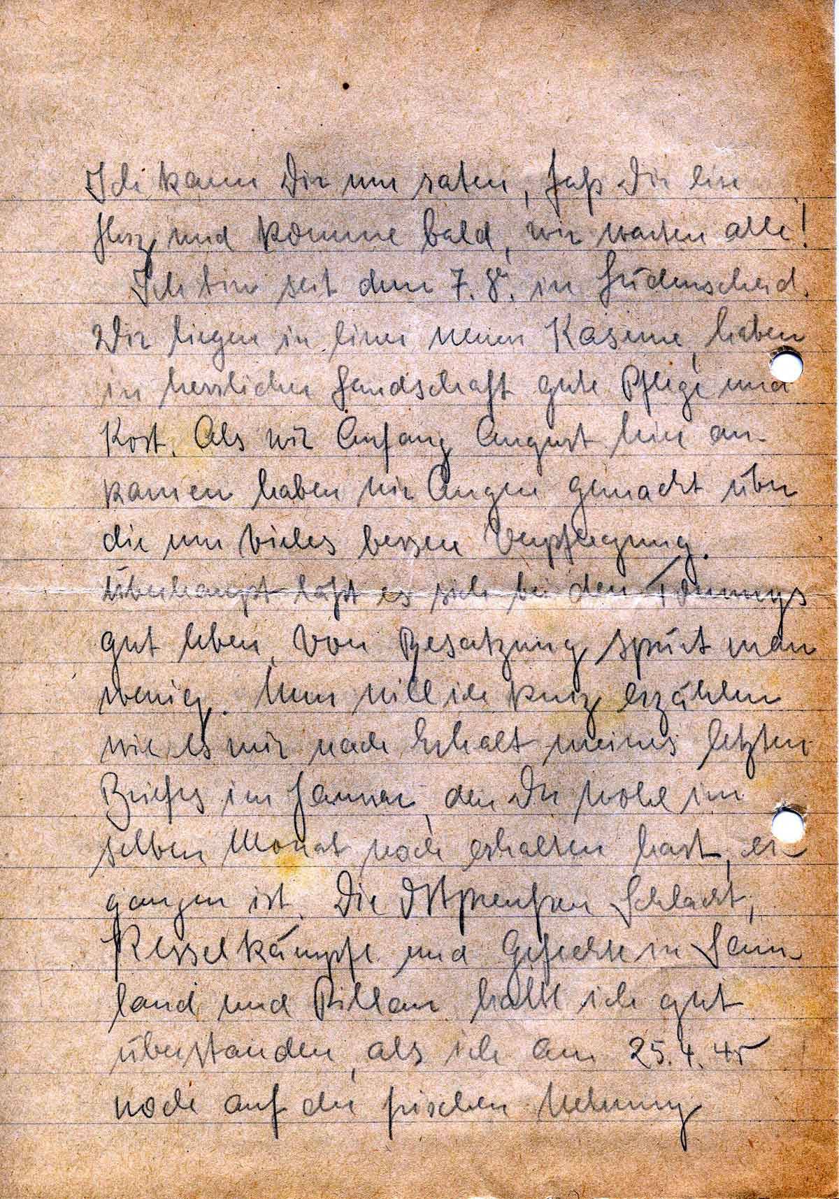 Überhaupt läßt es sich bei den Tommys gut leben. Von Besatzung spürt man wenig. Nun will ich kurz erzählen wie es mir nach Erhalt meines letzten Briefes im Januar, den Du wohl im selben Monat noch erhalten hast, ergangen ist. Die Ostpreußen Schlacht, Kesselkämpfe und Gefechte in Sennland und Pillau hatte ich gut überstanden, als ich am 25.4.45 noch auf der frischen Nehrung