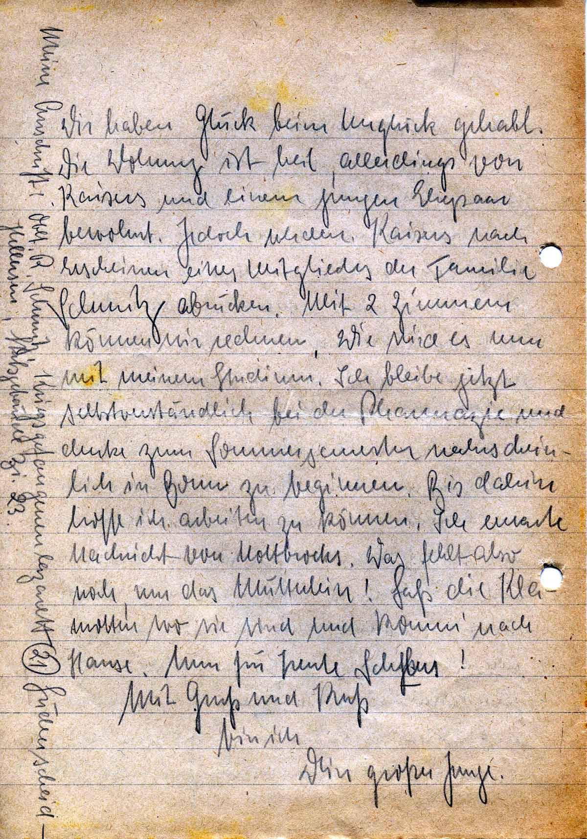 Wir haben Glück beim Unglück gehabt. Die Wohnung ist heil, allerdings von Kaisers und einem jungen Ehepaar bewohnt. Jedoch werden Kaisers nach Erscheinen eines Mitgliedes der Familie Schmitz abrücken. Mit 2 Zimmern können wir rechnen. Wie wird es nun mit meinem Studium. Ich bleibe jetzt selbstverständlich bei der Pharmazie und denke zum Sommersemester wahrscheinlich in Bonn zu beginnen. Bis dahin hoffe ich arbeiten zu können. Ich erwarte Nachricht von Nottbrocks. Was fehlt also noch, nur das Mütterlein! Laß die Klamotten wo sie sind und komm‘ nach Hause. Nun für heute Schlus!