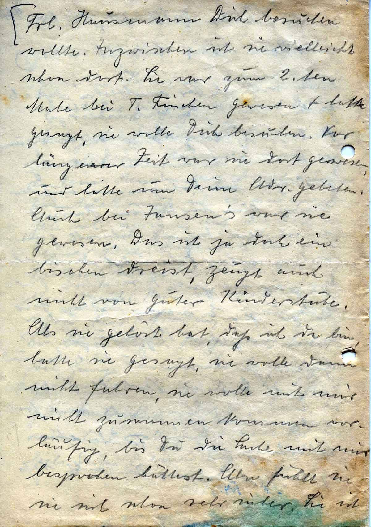 Frl. Hausmann Dich besuchen wollte. Inzwischen ist sie vielleicht schon dort. Sie war zum 2.ten Male bei T. Finchen gewesen + hatte gesagt, sie wolle Dich besuchen. Vor längerer Zeit war sie dort gewesen, und hatte um Deine Adr. gebeten. Auch bei Jansen’s war sie gewesen. Das ist ja doch ein bischen dreist, zeugt auch nicht von guter Kinderstube. Als sie gehört hat, daß ich da bin, hatte sie gesagt, sie wolle dann nicht fahren, sie wolle mit mir nicht zusammen kommen vorläufig, bis Du die Sache mit mir besprochen hättest. Also fühlt sie sie sich schon sehr sicher. Sie ist