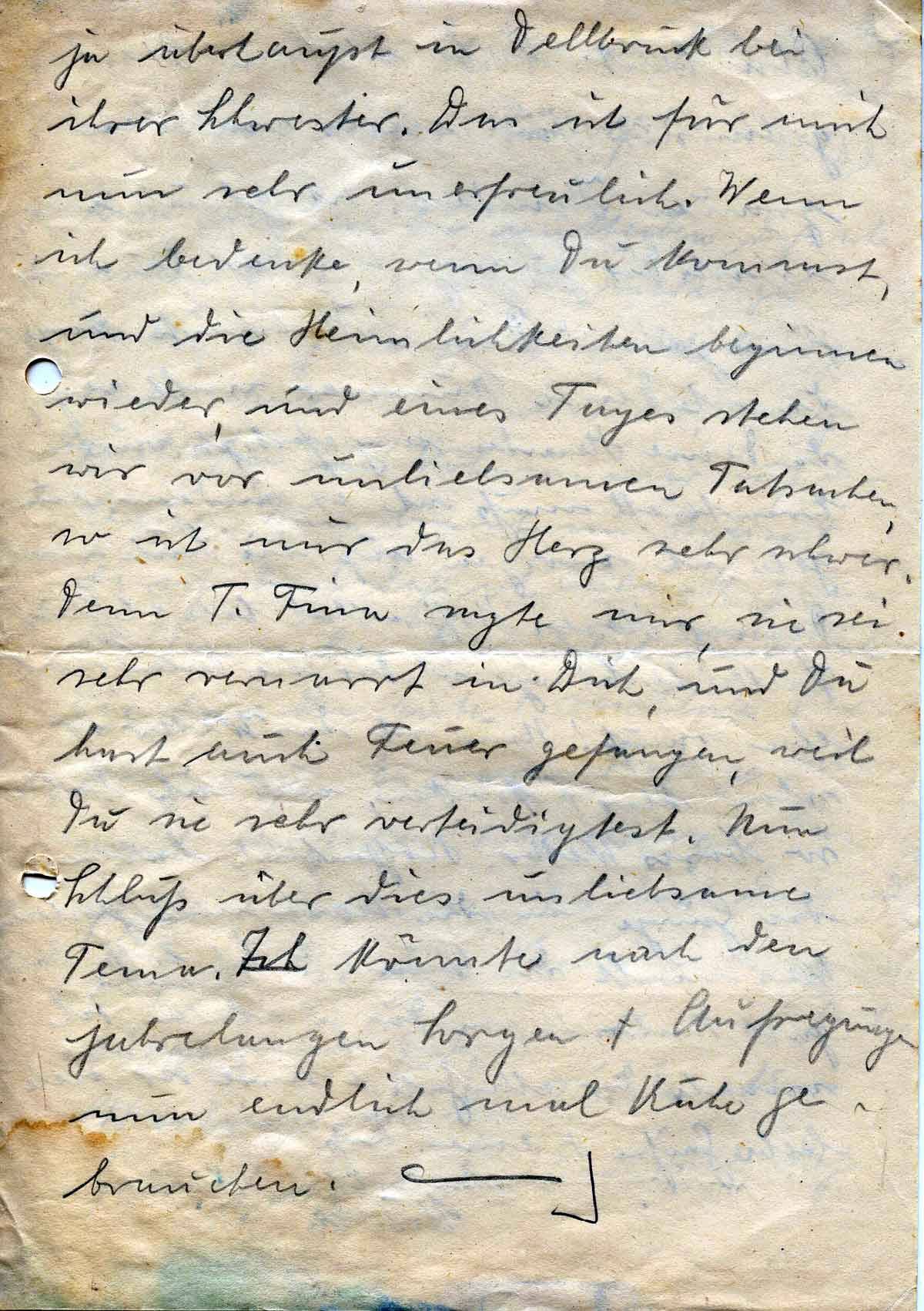 ja überhaupt in Dellbrück bei ihrer Schwester. Das ist für mich nun sehr unerfreulich. Wenn ich bedenke, wenn Du kommst, und die Heimlichkeiten beginnen wieder, und eines Tages stehen wir vor unliebsamen Tatsachen, so ist mir das Herz sehr schwer. Denn T. Fina sagte mir, sie sei sehr vernarrt in Dich und Du hast auch Feuer gefangen, weil Du sie sehr verteidigtest. Nun Schluß über dies unliebsame Tema. Ich könnte nach den jahrelangen Sorgen + Aufregungen nun endlich mal Ruhe gebrauchen. –