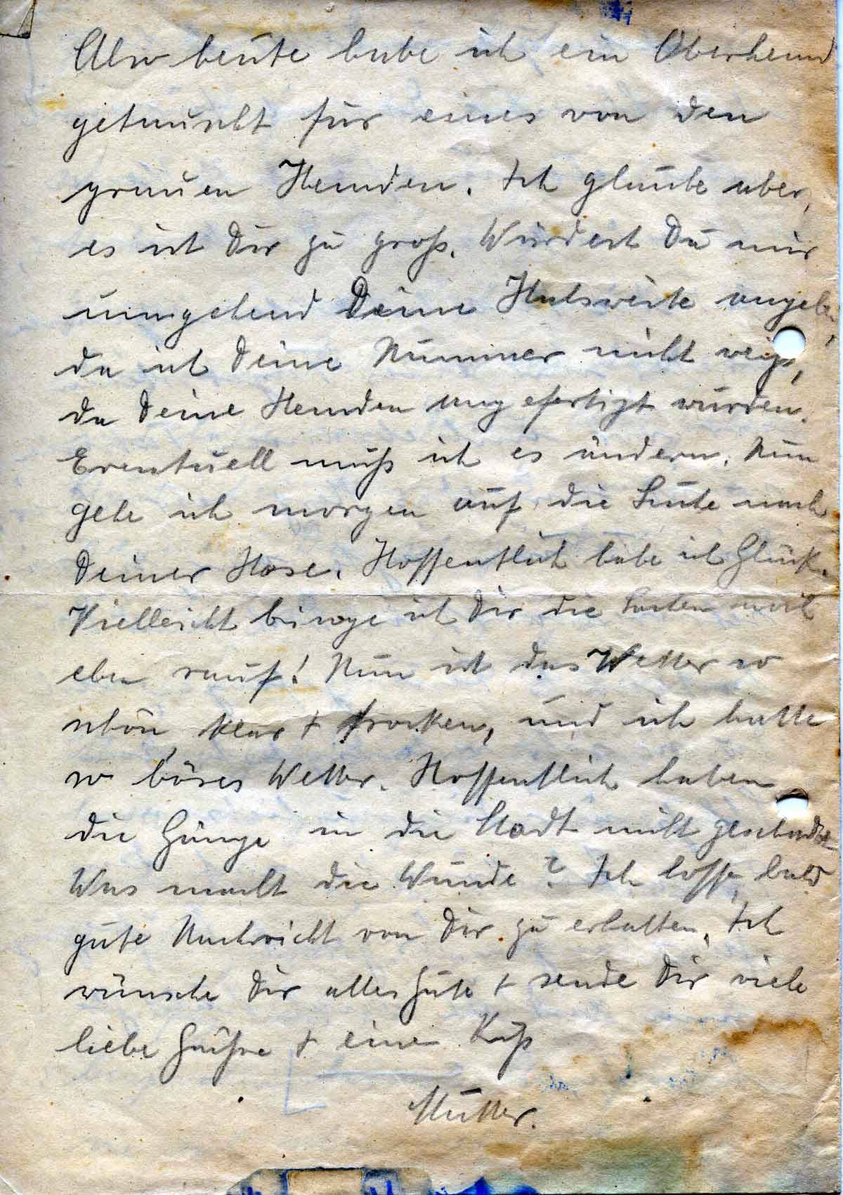 Also heute habe ich ein Oberhemd getauscht für eines von den grauen Hemden. Ich glaube aber, es ist Dir zu groß. Würdest Du mir umgehend Deine Halsweite angeben, da ich Deine Nummer nicht weiß, da Deine Hemden angefertigt wurden. Eventuell muß ich es ändern. Nun gehe ich morgen auf die Suche nach Deiner Hose. Hoffentlich habe ich Glück. Vielleicht bringe ich Dir die Sachen noch eben rauf! Nun ist das Wetter so schön klar + trocken, und ich hatte so böses Wetter. Hoffentlich haben die Gänge in die Stadt nicht geschadet. Was macht die Wunde? Ich hoffe, bald gute Nachricht von Dir zu erhalten. Ich wünsche Dir alles Gute + sende Dir viele liebe Grüße + einen Kuß