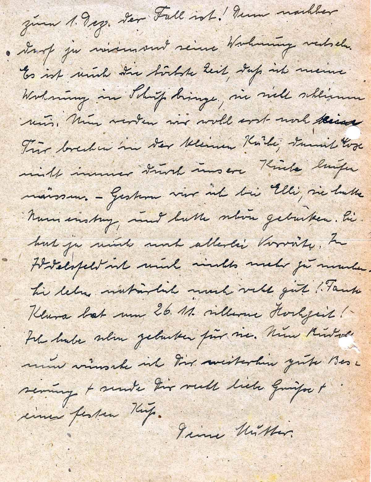 zum 1. Dez. der Fall ist! Denn nachher darf ja niemand seine Wohnung wechseln. Es ist auch die höchste Zeit, daß ich meine Wohnung in Schuß bringe, sie sieht schlimm aus. Nun werden wir wohl erst noch eine Tür brechen in der kleinen Küche, damit Cox nicht immer durch unsere Küche laufen müssen. – Gestern war ich bei Elli, sie hatte Namenstag, und hatte schön gebacken. Sie hat ja auch noch allerlei Vorräte. In Iddelsfeld ist auch nichts mehr zu machen. Sie leben natürlich noch recht gut! Tante Klara hat am 26.11. silberne Hochzeit! Ich habe schon gebacken für sie. Nun Rudolf nun wünsche ich Dir weiterhin gute Besserung + sende Dir recht liebe Grüße + einen festen Kuß