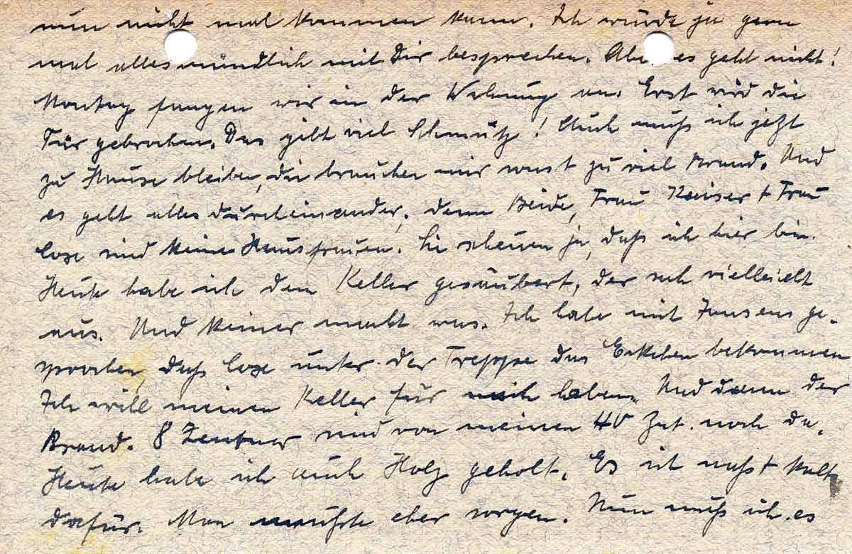 nun nicht mal kommen kann. Ich würde ja zu gern mal alles mündlich mit Dir besprechen. Aber es geht nicht! Montag fangen wir in der Wohnung an. Erst wird die Tür gebrochen. Das gibt viel Schmutz! Auch muß ich jetzt zu Hause bleiben, die brauchen mir sonst zu viel Brand. Und es geht alles durcheinander; denn Beide, Frau Kaiser + Frau Cox sind keine Hausfrauen. Sie scheuen ja, daß ich hier bin. Heute habe ich den Keller gesäubert, der sah vielleicht aus. Und keiner macht was. Ich habe mit Jansens gesprochen, daß Cox unter der Treppe das Eckchen bekommen. Ich will meinen Keller für mich haben. Und dann der Brand. 8 Zentner sind von meinen 40 Zet. noch da. Heute habe ich auch Holz geholt. Es ist naß + kalt dafür. Man mußte eher sorgen. Nun muß ich es