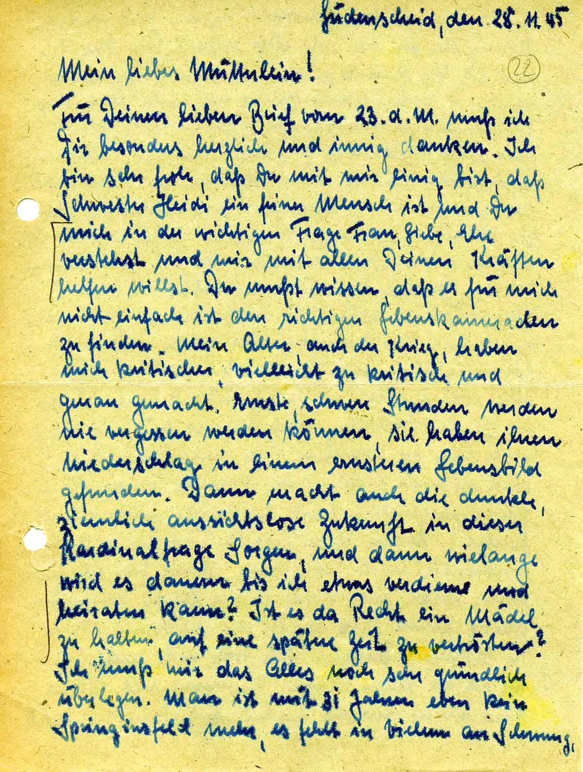 Für Deinen lieben Brief vom 23. d. M. muß ich Dir besonders herzlich und innig danken. Ich bin sehr froh, daß Du mit mir einig bist, daß Schwester Heidi ein feiner Mensch ist und Du mich in der wichtigen Frage Frau, Liebe, Ehe verstehst und mir mit allen Deinen Kräften helfen willst. Du mußt wissen, daß es für mich nicht einfach ist den richtigen Lebenskameraden zu finden. Mein Alter, auch der Krieg, haben mich kritischer, vielleicht zu kritisch und genau gemacht. Ernste, schwere Stunden werden nie vergessen werden können, sie haben ihren Niederschlag in einem ernsteren Lebensbild gefunden. Dann macht auch die dunkle, ziemliche aussichtslose Zukunft in dieser Kardinalfrage Sorgen, und dann wielange wird es dauern bis ich etwas verdiene und heiraten kann? Ist es da Recht ein Mädel zu halten, auf eine spätere Zeit zu vertrösten? Ich muß mir das Alles noch sehr gründlich überlegen. Man ist mit 31 Jahren eben kein Springinsfeld mehr, es fehlt in Vielem an Schwung,