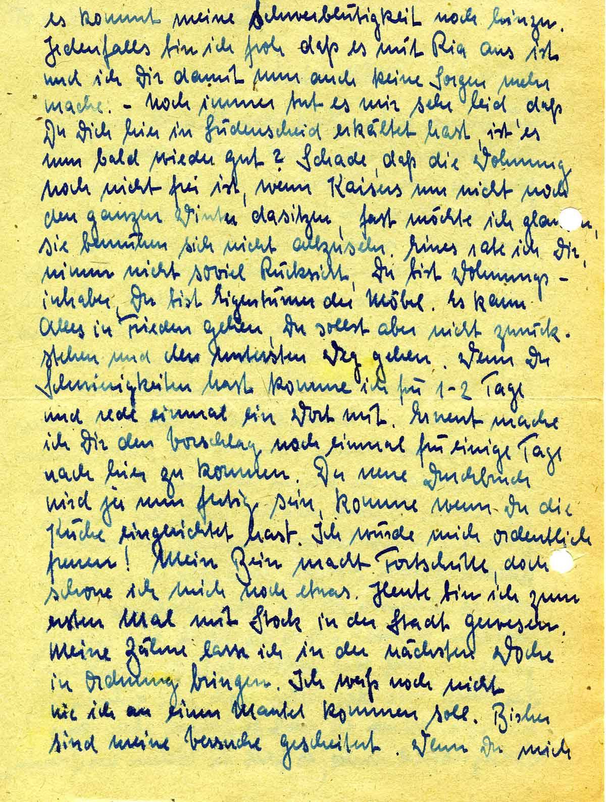 es kommt meine Schwerblütigkeit noch hinzu. Jedenfalls bin ich froh daß es mit Ria aus ist und ich Dir damit nun auch keine Sorgen mehr mache. – Noch immer tut es mir sehr leid, daß Du Dich hier in Lüdenscheid erkältet hast, ist es nun bald wieder gut? Schade, daß die Wohnung noch nicht frei ist, wenn Kaisers nur nicht noch den ganzen Winter dasitzen, fast möchte ich glauben, sie bemühen sich nicht allzu sehr. Eines rate ich Dir, nimm nicht soviel Rücksicht, Du bist Wohnungsinhaber, Du bist Eigentümer der Möbel. Es kann Alles in Frieden gehen, Du sollst aber nicht zurückstehen und den untersten Weg gehen. Wenn Du Schwierigkeiten hast komme ich für 1-2 Tage und rede einmal ein Wort mit. Erneut mache ich Dir den Vorschlag noch einmal für einige Tage nach hier zu kommen. Der neue Durchbruch wird ja nun fertig sein, komme wenn Du die Küche eingerichtet hast. Ich würde mich ordentlich freuen! Mein Bein macht Fortschritte, doch schone ich mich noch etwas. Heute bin ich zum ersten Mal mit Stock in der Stadt gewesen. Meine Zähne lasse ich in der nächsten Woche in Ordnung bringen. Ich weiß noch nicht wie ich an einen Mantel kommen soll. Bisher sind meine Versuche gescheitert. Wenn Du mich