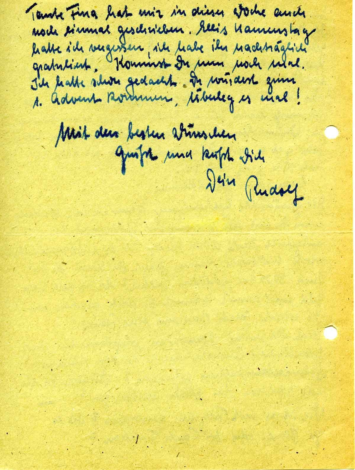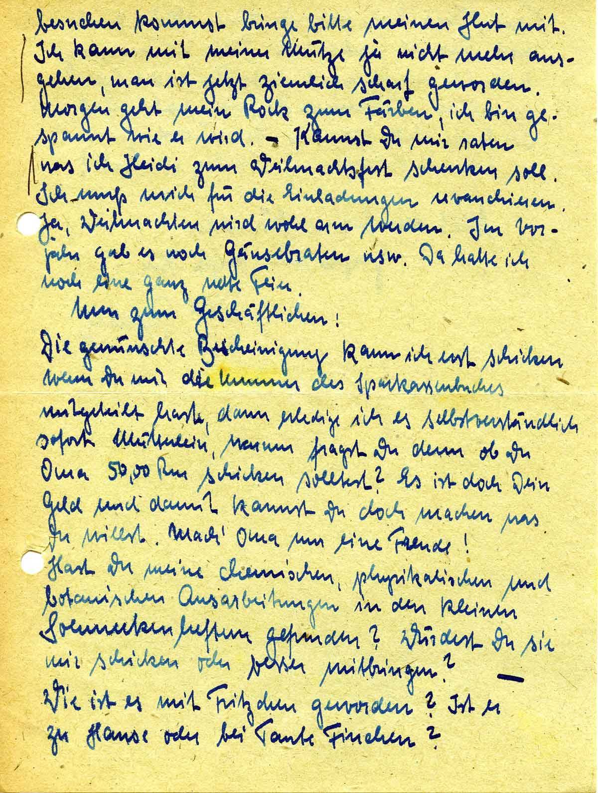besuchen kommst bringe bitte meinen Hut mit. Ich kann mit meiner Mütze ja nicht mehr ausgehen, man ist jetzt ziemlich scharf geworden. Morgen geht mein Rock zum Färben, ich bin gespannt wie er wird. – Kannst Du mir raten was ich Heidi zum Weihnachtsfest schenken soll. Ich muß mich für die Einladungen revanchieren. Ja, Weihnachten wird wohl arm werden. Im Vorjahr gab es noch Gänsebraten usw. Da hatte ich noch eine ganz nette Feier.