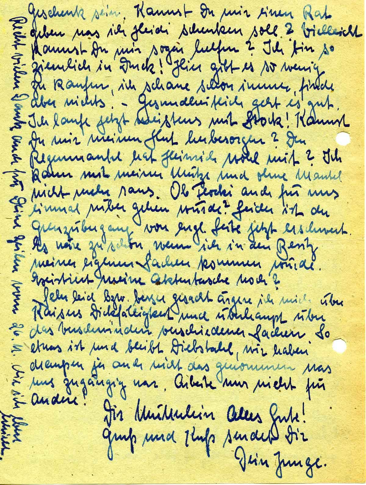 Geschenk sein. Kannst Du mir einen Rat geben was ich Heidi schenken soll? Vielleicht kannst Du mir sogar helfen? Ich bin so ziemlich in Druck! Hier gibt es so wenig zu kaufen, ich schaue schon immer, finde aber nichts. – Gesundheitlich geht es gut. Ich laufe jetzt meistens mit Stock! Kannst Du mir meinen Hut herbesorgen? Den Regenmantel hat Heinrich wohl mit? Ich kann mit meiner Mütze und ohne Mantel nicht mehr raus. Ob Flocki auch für uns einmal rüber gehen würde? Leider ist der Grenzübergang von engl. Seite jetzt erschwert. Es wäre zu schön, wenn ich in den Besitz meiner eigenen Sachen kommen würde. Existiert meine Aktentasche noch?