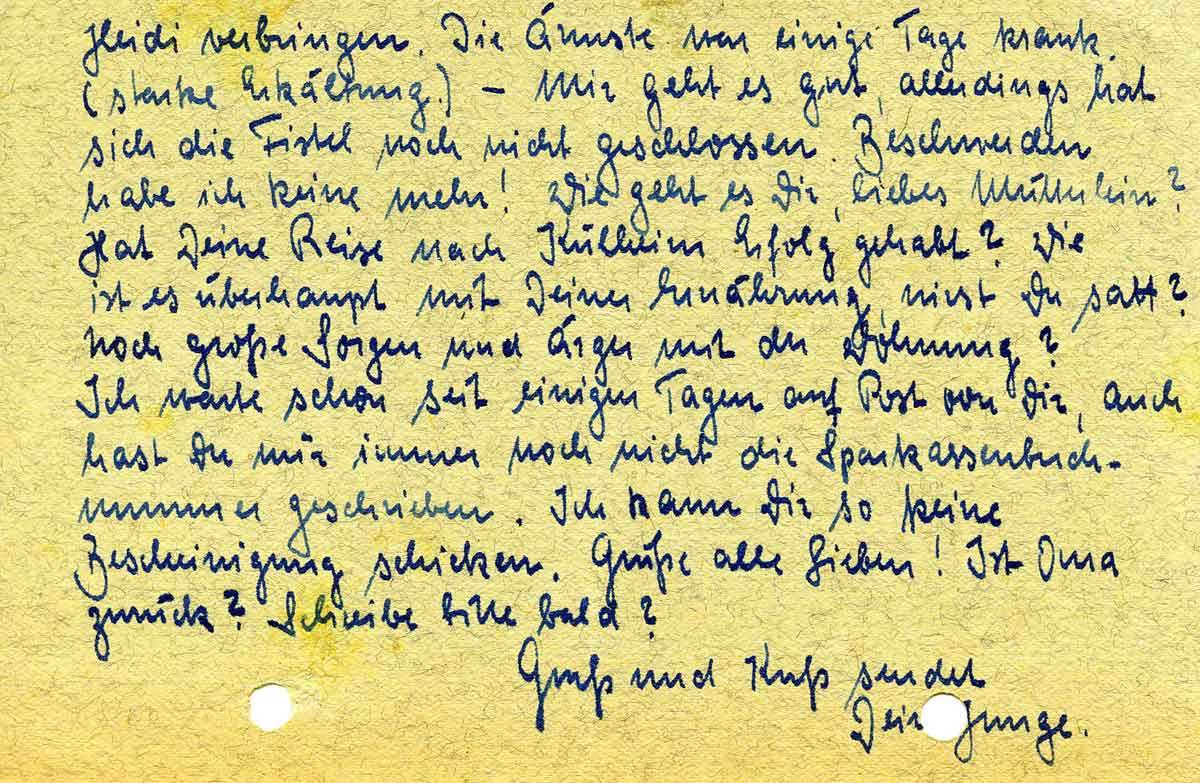 Heidi verbringen. Die Ärmste war einige Tage krank. (starke Erkältung.) – Mir geht es gut, allerdings hat sich die Fistel noch nicht geschlossen. Beschwerden habe ich keine mehr! Wie geht es Dir, liebes Mütterlein? Hat Deine Reise nach Külheim Erfolg gehabt? Wie ist es überhaupt mit Deiner Ernährung, wirst Du satt? Noch große Sorgen und Ärger mit der Wohnung? Ich warte schon seit einigen Tagen auf Post von Dir, auch hast Du mir immer noch nicht die Sparkassenbuchnummer geschrieben. Ich kann Dir so keine Bescheinigung schicken. Grüße alle Lieben! Ist Oma zurück? Schreibe bitte bald?
