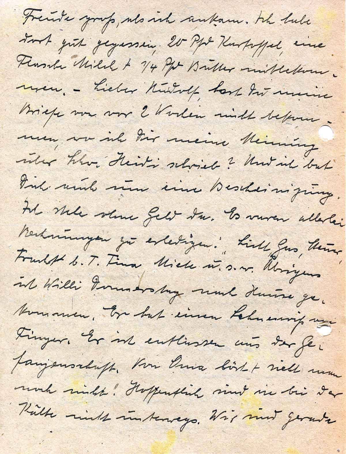 Freude groß, als ich ankam. Ich habe dort gut gegessen, 20 Pfd. Kartoffel, eine Flasche Milch + ¼ Pfd. Butter mitbekommen. – Lieber Rudolf, hast Du meine Briefe von vor 2 Wochen nicht bekommen, wo ich Dir meine Meinung über Schw. Heidi schrieb? Und ich bat Dich auch um eine Bescheinigung. Ich stehe ohne Geld da. Es waren allerlei Rechnungen zu erledigen: Licht, Gas, Steuer, [..] b. T. Fina, Miete u.s.w. Übrigens ist Willi Donnerstag nach Hause gekommen. Er hat einen Sehnenriß am Finger. Er ist entlassen aus der Gefangenschaft. Von Oma hört + sieht man noch nichts! Hoffentlich sind sie bei der Kälte nicht unterwegs. Wir sind gerade