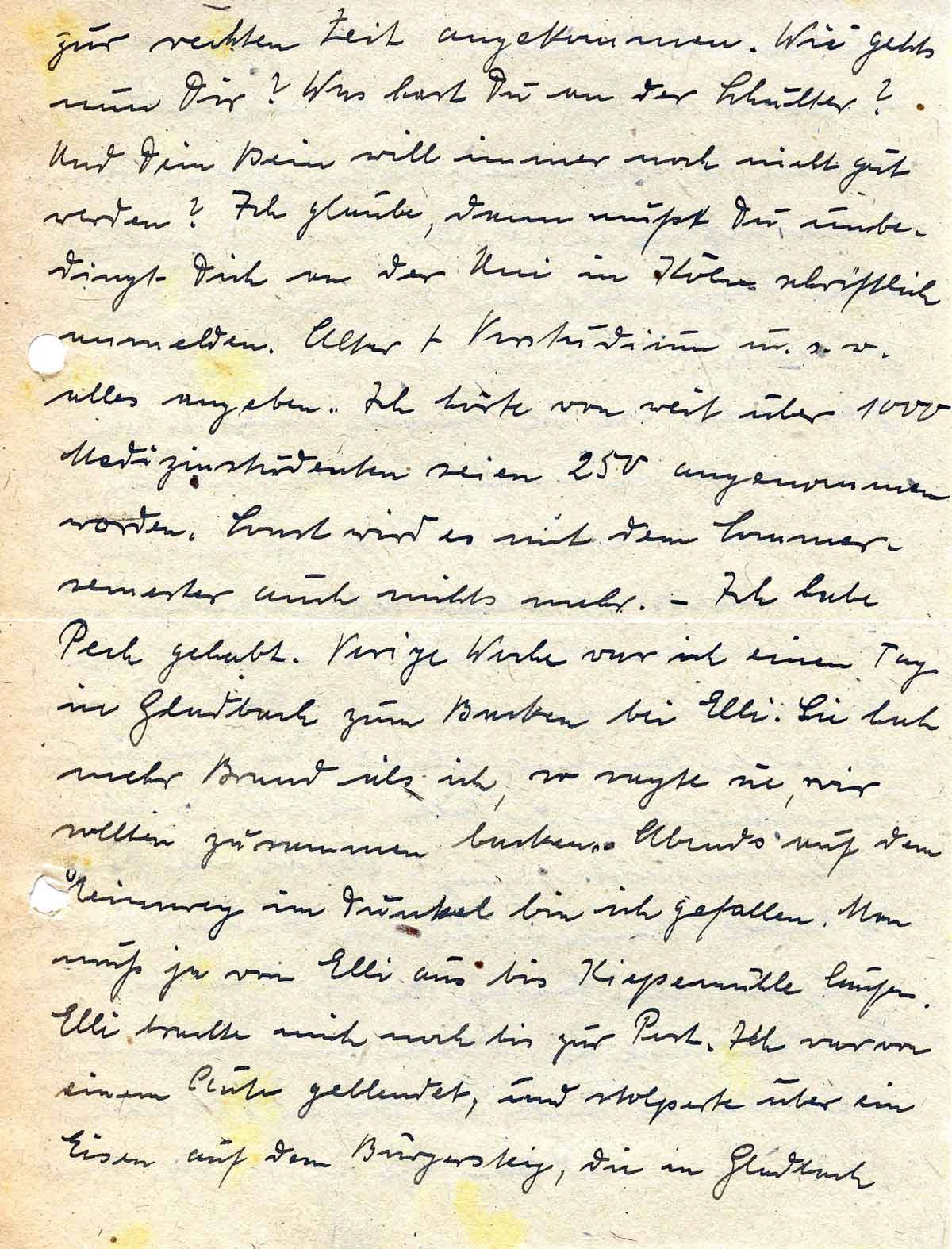 zur rechten Zeit angekommen. Wie gehts nun Dir? Was hast Du an der Schulter? Und Dein Bein will immer noch nicht gut werden? Ich glaube, dann mußt Du unbedingt Dich an der Uni in Köln schriftlich anmelden. Alter + Vorstudium u.s.w alles angeben. Ich hörte von weit über 1000 Medizinstudenten seien 250 angenommen worden. Sonst wird es mit dem Sommersemester auch nichts mehr. – Ich habe Pech gehabt. Vorige Woche war ich einen Tag in Gladbach zum Backen bei Elli. Sie hat mehr Brand als ich, so sagte sie, wir sollen zusammen backen. Abends auf dem Heimweg im Dunkel bin ich gefallen. Man muß ja von Elli aus bis Kiepemühle laufen. Elli brachte mich noch bis zur Post. Ich war von einem Auto geblendet, und stolperte über ein Eisen auf dem Bürgersteig, die in Gladbach