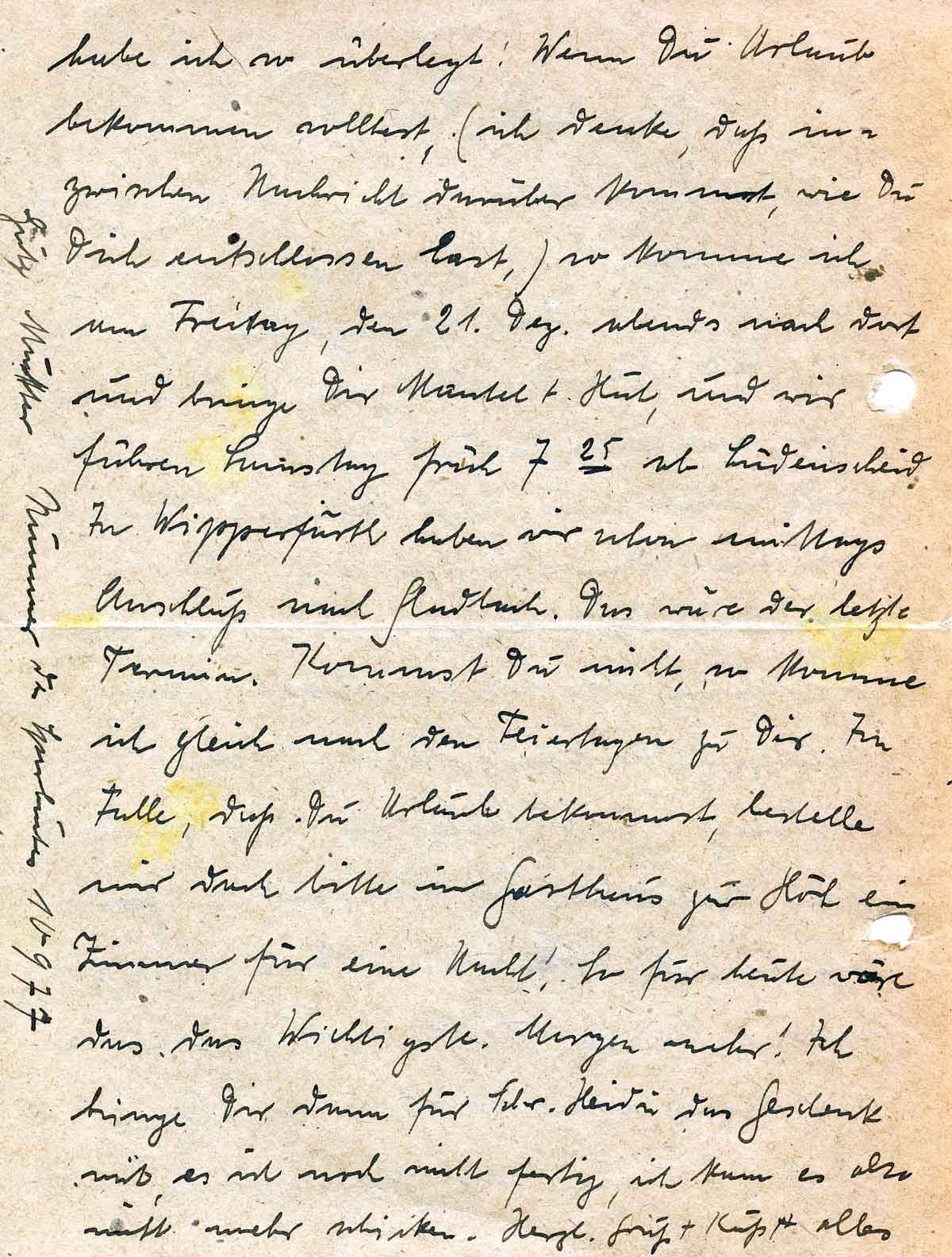 habe ich so überlegt: Wenn Du Urlaub bekommen solltest, (ich denke, daß inzwischen Nachricht darüber kommt, wie Du Dich entschlossen hast,) so komme ich am Freitag, den 21. Dez. abends nach dort und bringe Dir Mantel + Hut, und wir führen Samstag früh 7.25 ab Lüdenscheid. In Wipperfürth haben wir schon mittags Anschluß nach Gladbach. Das wäre der letzte Termin. Kommst Du nicht, so komme ich gleich nach den Feiertagen zu Dir. Im Falle, daß Du Urlaub bekommst, bestelle mir doch bitte im Gasthaus zur Höh ein Zimmer für eine Nacht! So für heute wäre das das Wichtigste. Morgen mehr! Ich bringe Dir dann für Schw. Heidi das Geschenk mit, es ist noch nicht fertig, ich kann es also nicht mehr schicken. Herzl. Gruß + Kuß + alles
