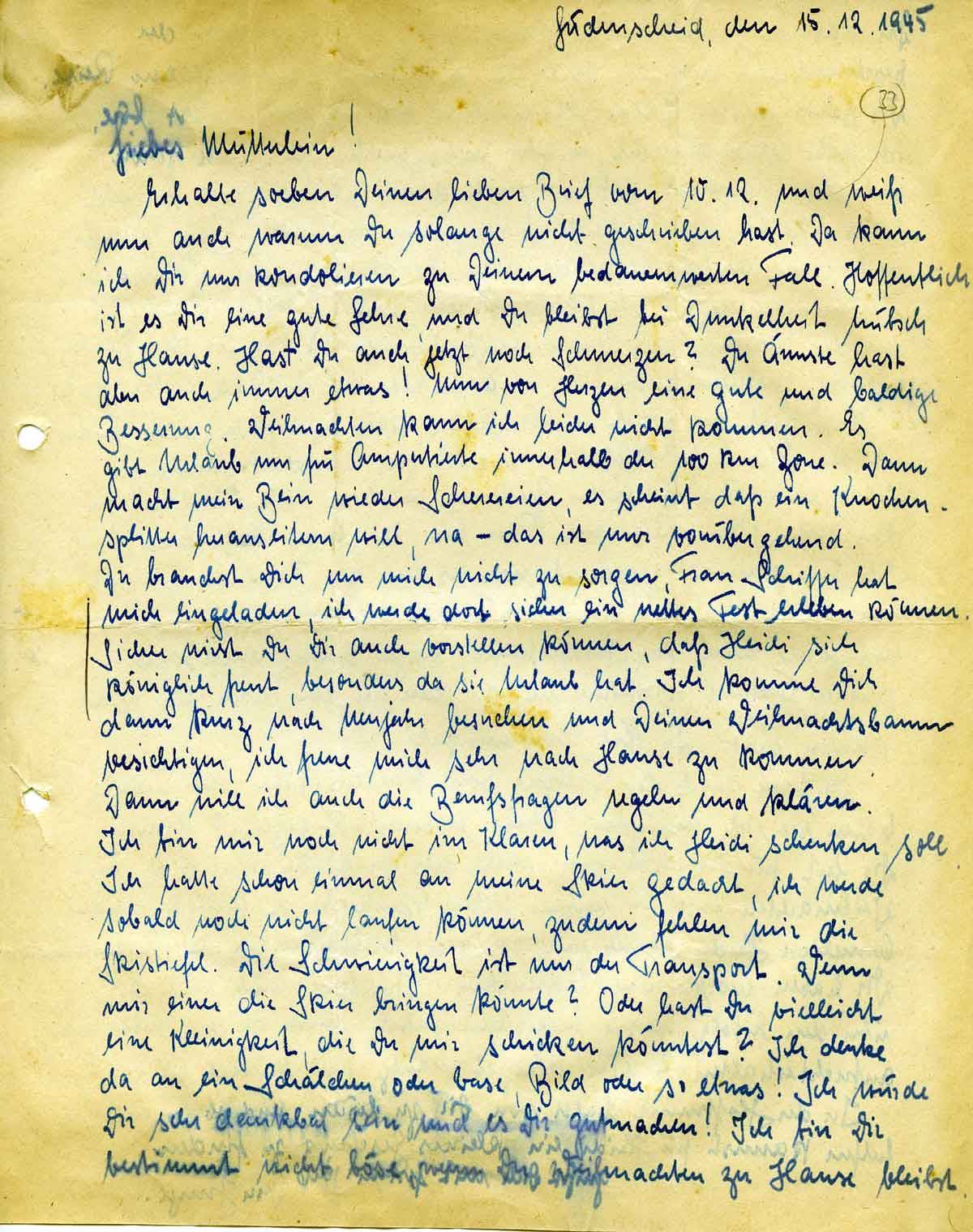 Erhalte soeben Deinen lieben Brief vom 10.12. und weiß nun auch warum Du solange nicht geschrieben hast. Da kann ich Dir nur kondolieren zu Deinem bedauernwerten Fall. Hoffentlich ist es Dir eine gute Lehre, und Du bleibst bei Dunkelheit hübsch zu Hause. Hast Du auch jetzt noch Schmerzen? Du Ärmste hast aber auch immer etwas! Nun von Herzen eine gute und baldige Besserung. Weihnachten kann ich leider nicht kommen. Es gibt Urlaub nur für Amputierte innerhalb der 100 km Zone. Dann macht mein Bein wieder Schmerzen, es scheint daß ein Knochensplitter herauseitern will, na – das ist nur vorübergehend.
