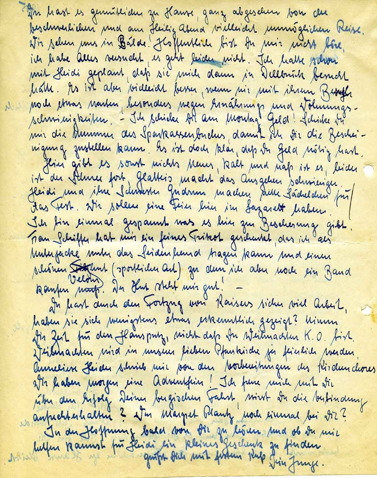 Du hast es gemütlicher zu Hause, ganz abgesehen von der beschwerlichen und am Heilig Abend vielleicht unmöglichen Reise. Wir sehen uns in Bälde! Hoffentlich bist Du mir nicht böse, ich habe Alles versucht, es geht leider nicht. Ich hatte schon mit Heidi geplant, daß sie mich dann in Dellbrück besucht hätte. Es ist aber vielleicht besser, wenn wir mit ihrem Besuch noch etwas warten, besonders wegen Ernährungs und Wohnungsschwierigkeiten. – Ich schicke Dir am Montag Geld! Schicke Du mir die Nummer des Sparkassenbuches, damit ich Dir die Bescheinigung zustellen kann. Es ist doch klar, daß Du Geld nötig hast.