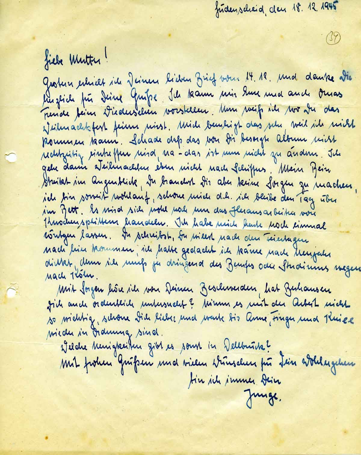 Rudolf Schmitz an Mutter Anna, 18. Dezember 1945