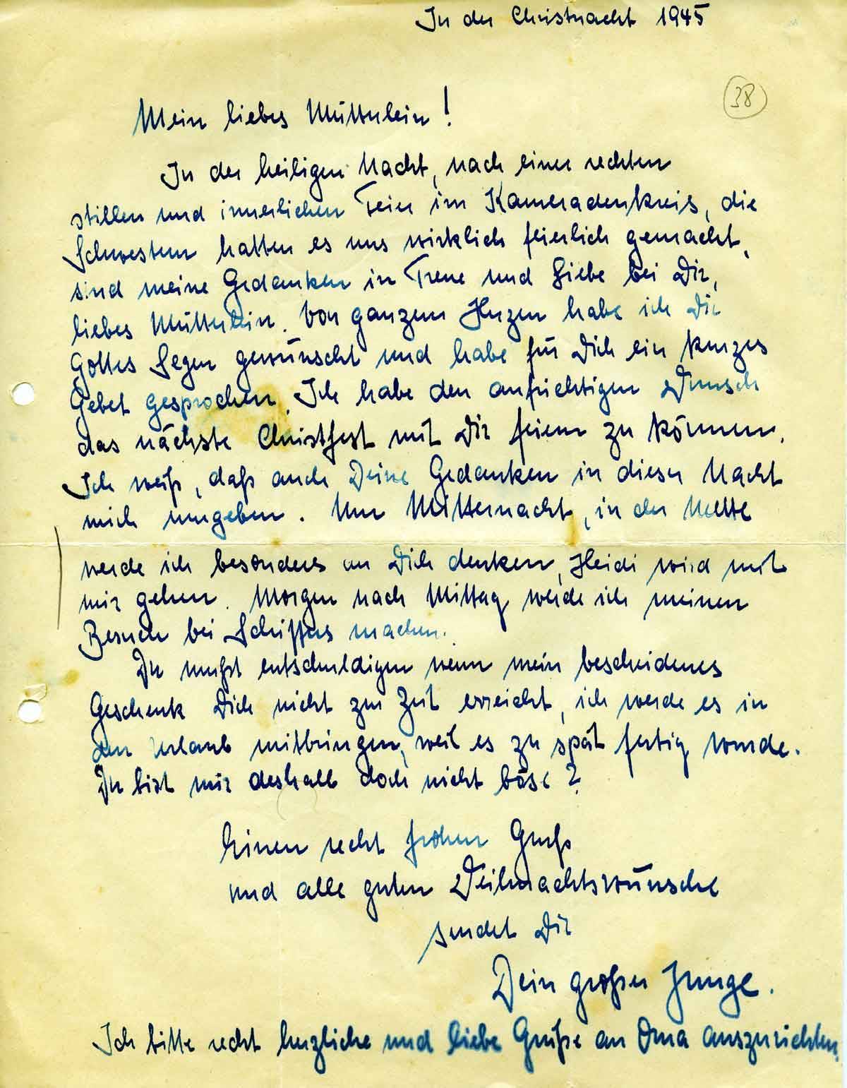 In der heiligen Nacht, nach einer rechten stillen und innerlichen Feier im Kameradenkreis, die Schwestern hatten es uns wirklich feierlich gemacht, sind meine Gedanken in Treue und Liebe bei Dir, liebes Mütterlein. Von ganzem Herzen habe ich Dir Gottes Segen gewünscht und habe für Dich ein kurzes Gebet gesprochen. Ich habe den aufrichtigen Wunsch das nächste Christfest mit Dir feiern zu können. Ich weiß, daß auch Deine Gedanken in dieser Nacht mich umgeben. Um Mitternacht, in der Mette werde ich besonders an Dich denken, Heidi wird mit mir gehen. Morgen nach Mittag werde ich meinen Besuch bei Schiffers machen.