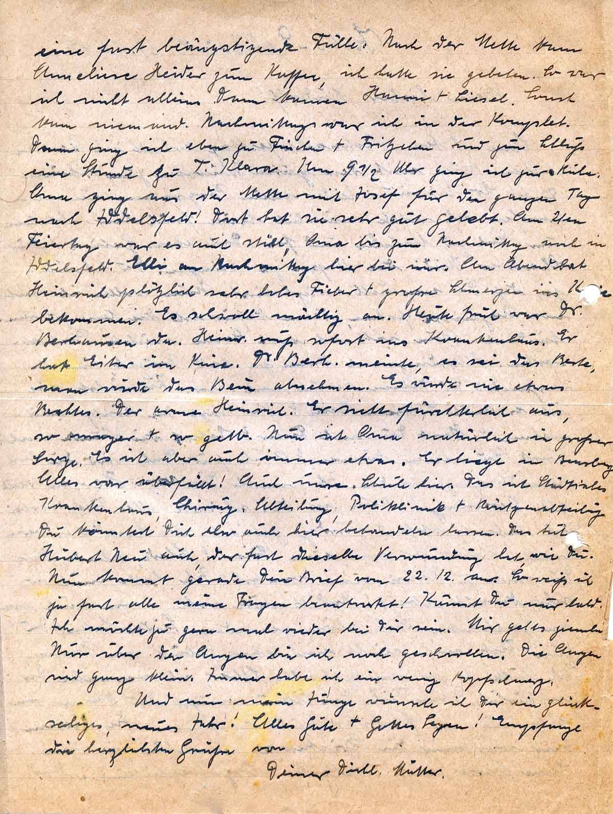 eine fast beängstigende Fülle. Nach der Mette kam Anneliese Heider zum Kaffee, ich hatte sie gebeten. So war ich nicht allein. Dann kamen Hanni + Liesel. Sonst kam niemand. Nachmittags war ich in der Komplet. Dann ging ich eben zu Finchen + Fritzchen und zum Schluß eine Stunde zu T. Klara. Um 9 ½ Uhr ging ich zur Ruhe. Oma ging aus der Mette mit Josef für den ganzen Tag nach Iddelsfeld! Dort hat sie sehr gut gelebt. Am 2ten Feiertag war es auch still, Oma bis zum Nachmittag noch in Iddelsfeld. Elli am Nachmittag hier bei mir. Am Abend hat Heinrich plötzlich sehr hohes Fieber + große Schmerzen ins Knie bekommen. Es schwoll mächtig an. Heute früh war Dr. Berhausen da. Heinr. muß sofort ins Krankenhaus. Er hat Eiter im Knie. Dr. Berh. meinte, es sei das Beste, man würde das Bein abnehmen. Es würde nie etwas Rechtes. Der arme Heinrich. Er sieht fürchterlich aus, so mager + so gelb. Nun ist Oma natürlich in großer Sorge. Es ist aber auch immer etwas. Er liegt in Bensberg. Alles war überfüllt! Auch unsere Schule hier. Das ist Städtisches Krankenhaus, Chirurg. Abteilung, Poliklinik + Röntgenabteilung. Du könntest Dich also auch hier behandeln lassen. Das tut Hubert Neu auch, der fast dieselbe Verwundung hat, wie Du. Nun kommt gerade Dein Brief vom 22.12. an. So weiß ich ja fast alle meine Fragen beantwortet! Kämst Du nur bald. Ich möchte ja gern mal wieder bei Dir sein. Mir gehts ziemlich. Nur über den Augen bin ich noch geschwollen. Die Augen sind ganz klein. Immer habe ich ein wenig Kopfschmerz.